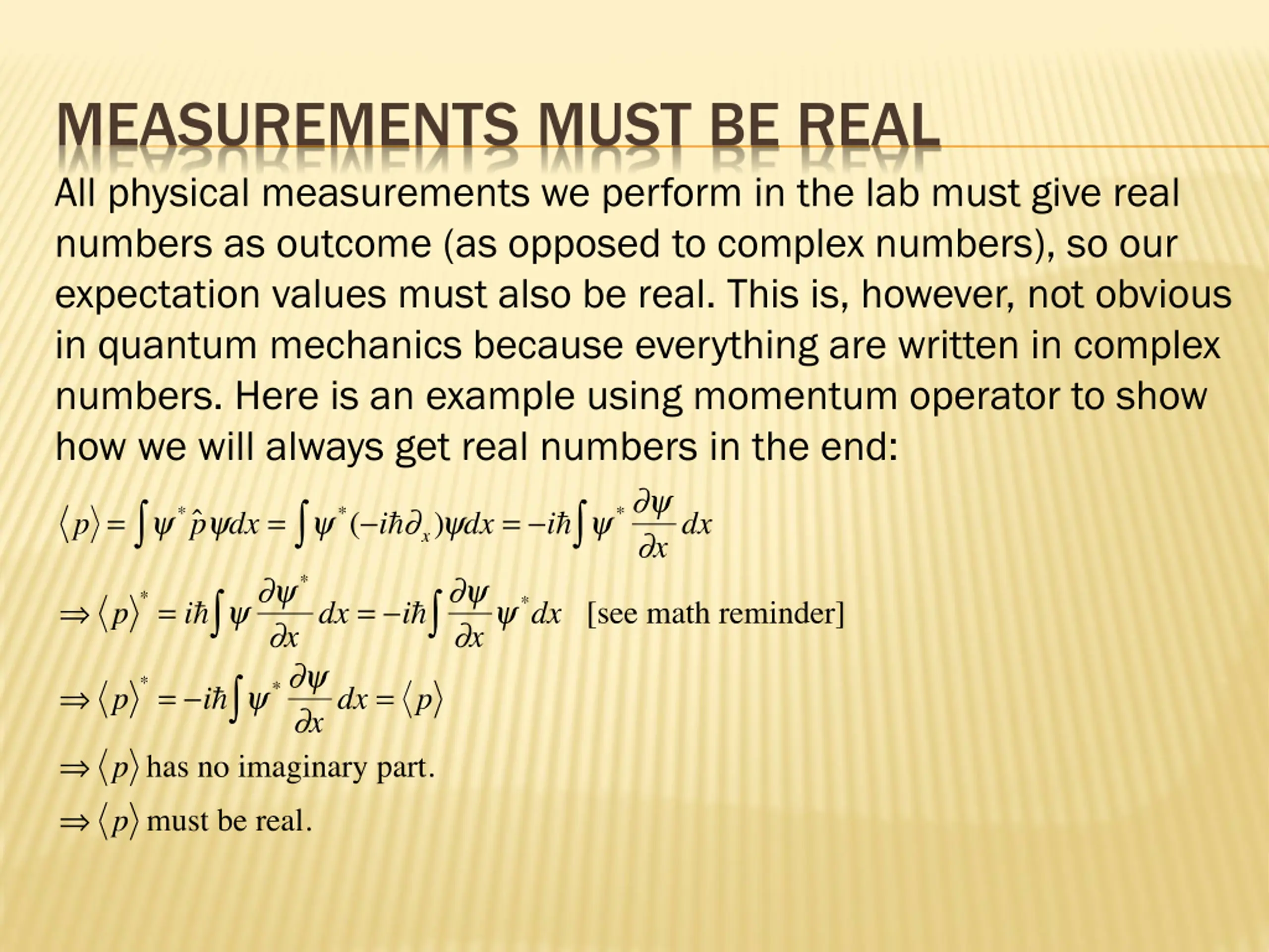 MEASUREMENTS MUST BE REAL All physical measurements we perform in the lab must give real numbers as outcome (as opposed to complex numbers), so our expectation values must also be real. This is, however, not obvious in quantum mechanics because everything are written in complex numbers. Here is an example using momentum operator to show how we will always get real numbers in the end: