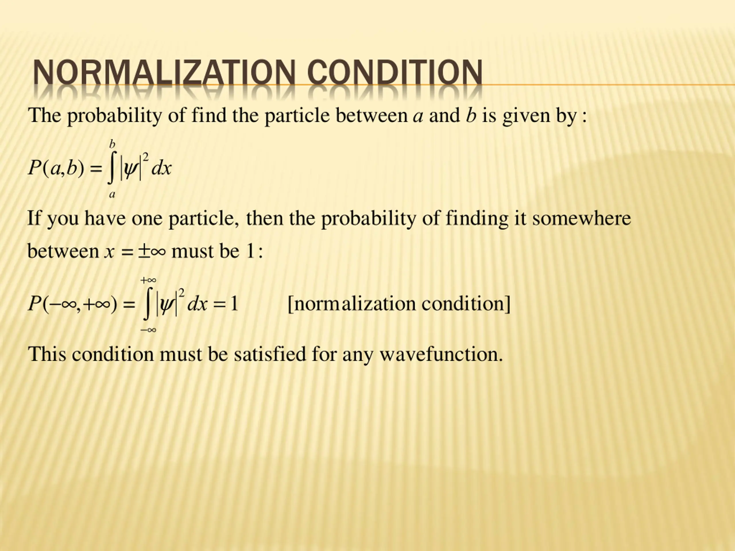 NORMALIZATION CONDITION The probability of find the particle between a and b is given by: b 2dx P(a,b) = y a If you have one particle, then the probability of finding it somewhere between x = must be 1: + 2dx P(- ,+ ) = y =1 [normalization condition] - This condition must be satisfied for any wavefunction.