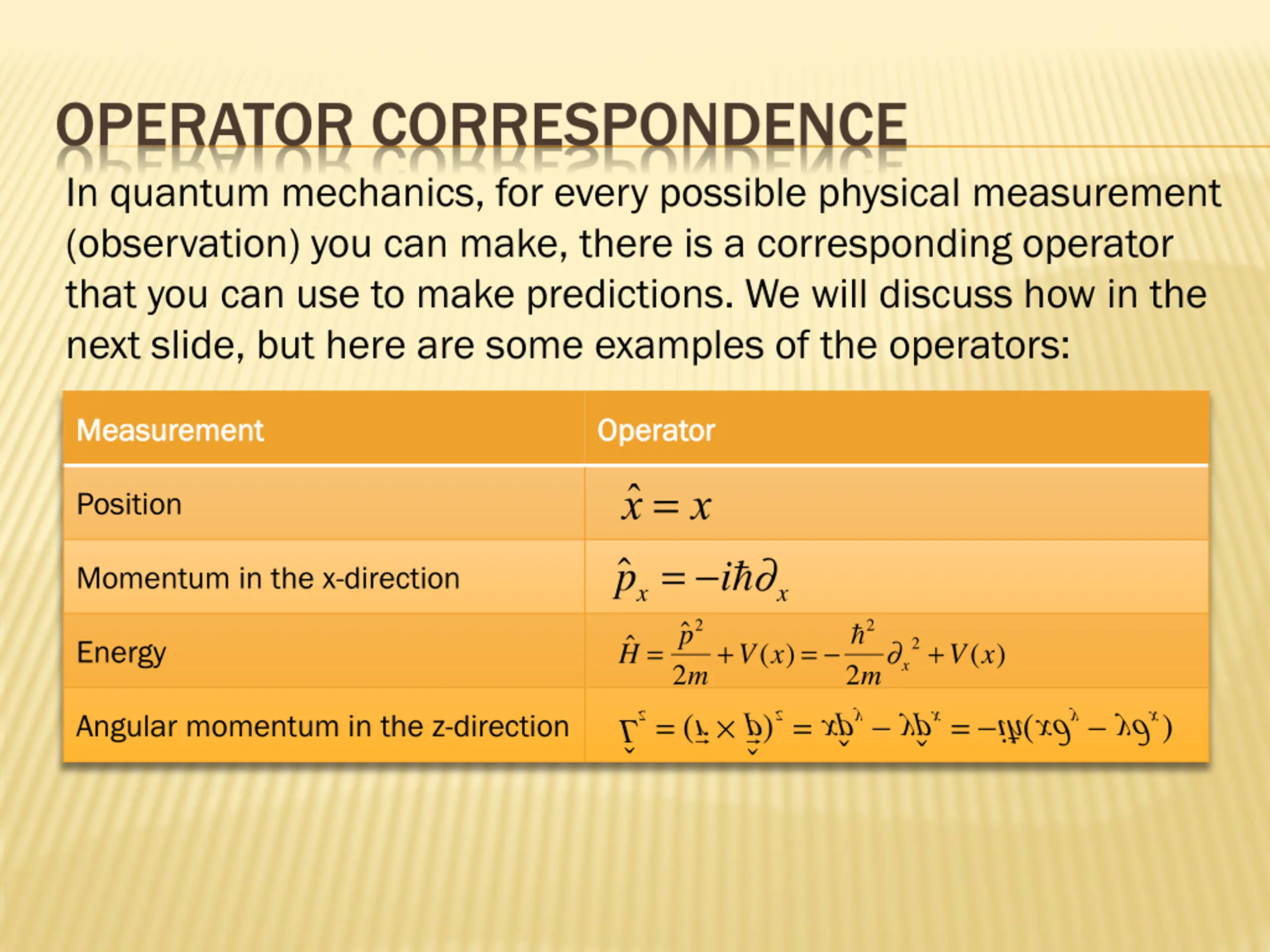 OPERATOR CORRESPONDENCE In quantum mechanics, for every possible physical measurement (observation) you can make, there is a corresponding operator that you can use to make predictions. We will discuss how in the next slide, but here are some examples of the operators: Measurement Measurement Operator Operator x = x Position Momentum in the x-direction Energy Angular momentum in the z-direction