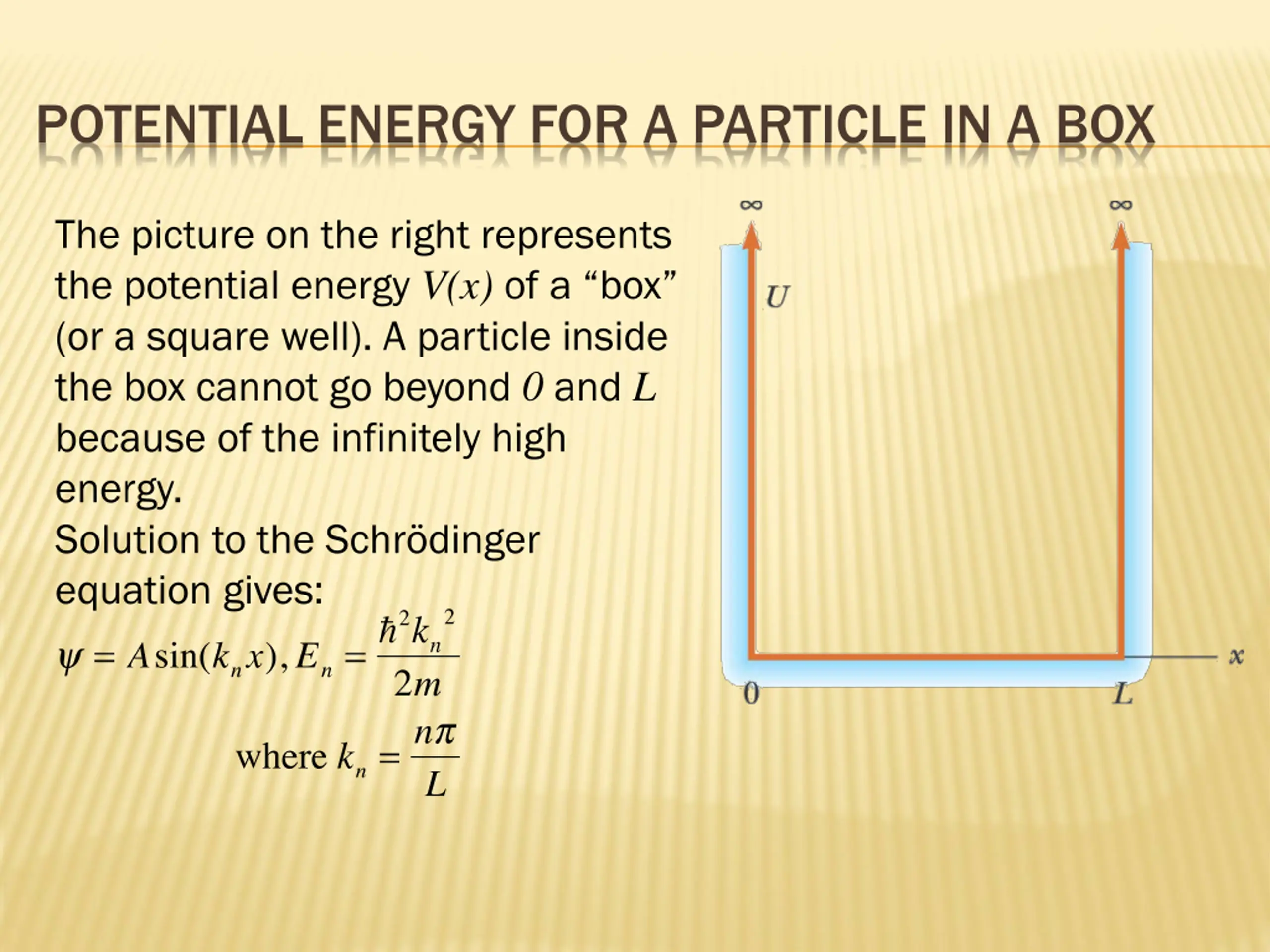POTENTIAL ENERGY FOR A PARTICLE IN A BOX The picture on the right represents the potential energy V(x)of a box (or a square well). A particle inside the box cannot go beyond 0 and L because of the infinitely high energy. Solution to the Schr dinger equation gives: