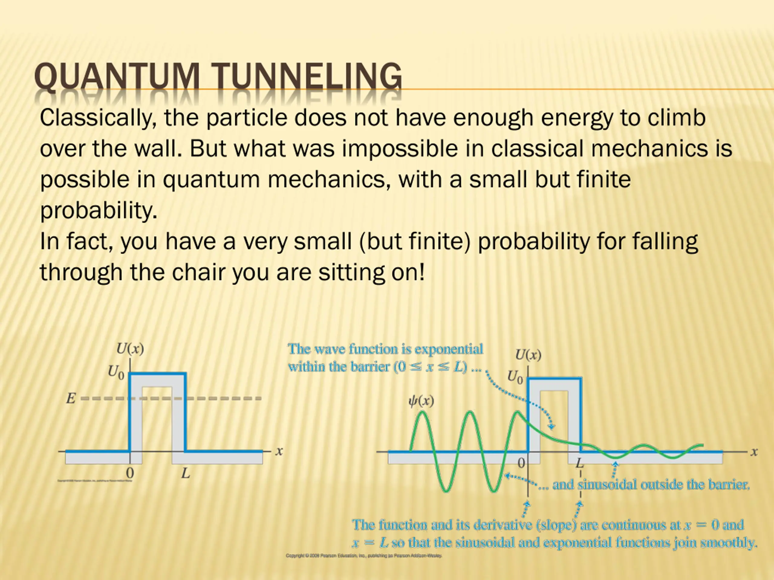 QUANTUM TUNNELING Classically, the particle does not have enough energy to climb over the wall. But what was impossible in classical mechanics is possible in quantum mechanics, with a small but finite probability. In fact, you have a very small (but finite) probability for falling through the chair you are sitting on!