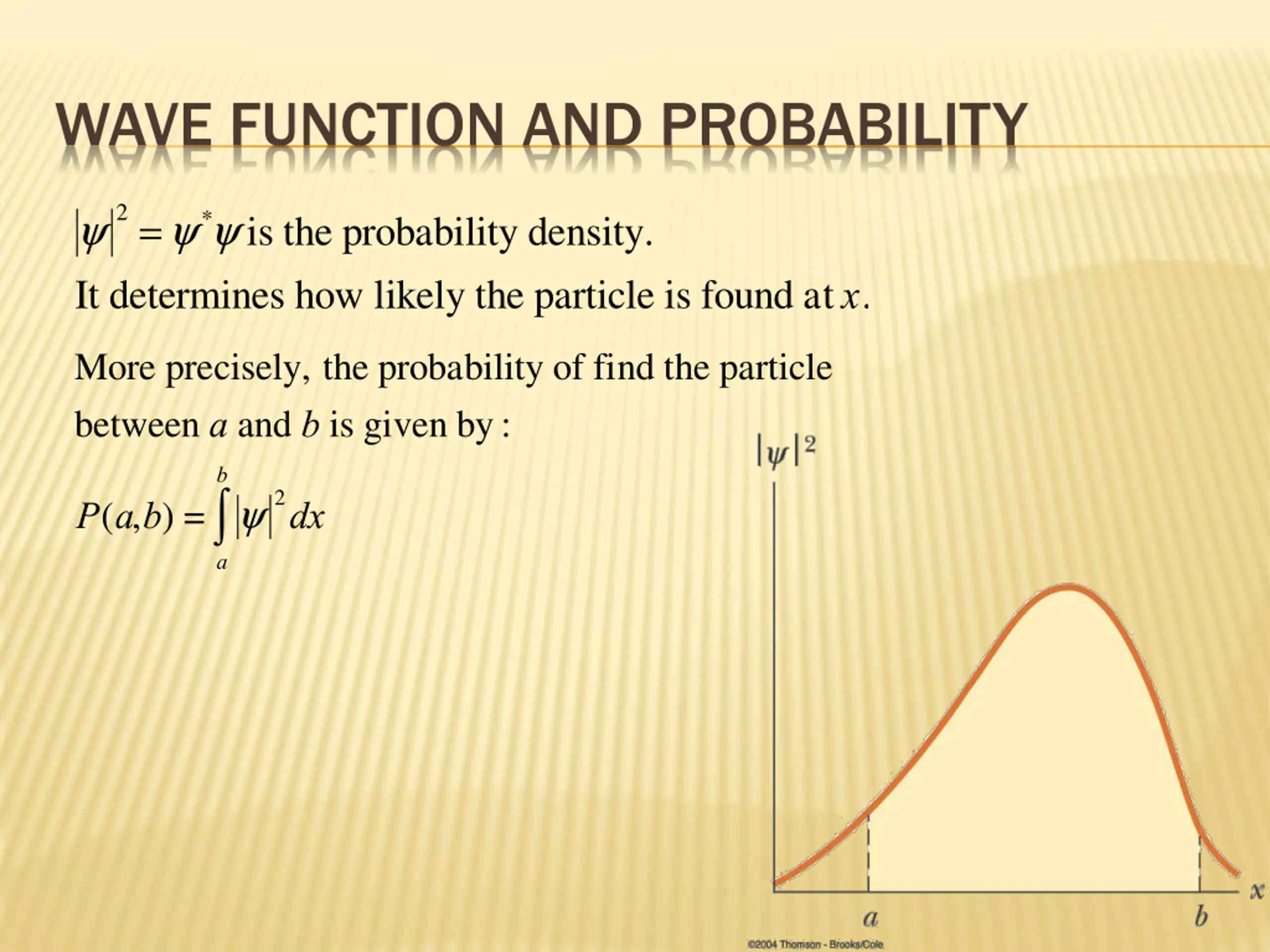 WAVE FUNCTION AND PROBABILITY 2=y*y is the probability density. y It determines how likely the particle is found at x. More precisely, the probability of find the particle between a and b is given by: b 2dx P(a,b) = y a