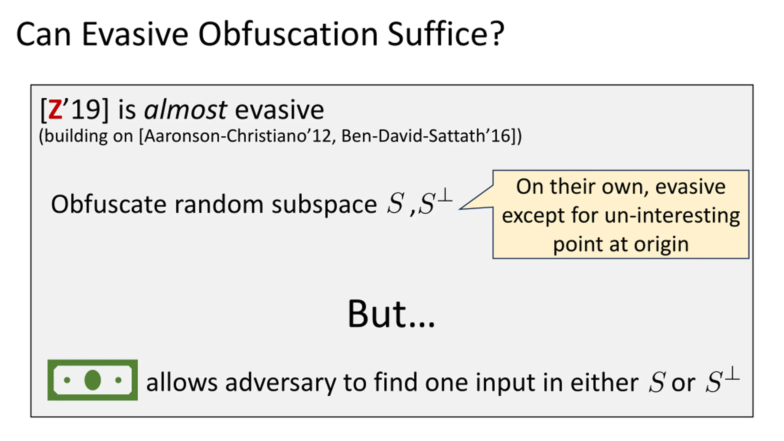 Can Evasive Obfuscation Suffice? [Z 19] is almost evasive (building on [Aaronson-Christiano 12, Ben-David-Sattath 16]) On their own, evasive except for un-interesting point at origin Obfuscate random subspace , But allows adversary to find one input in either or