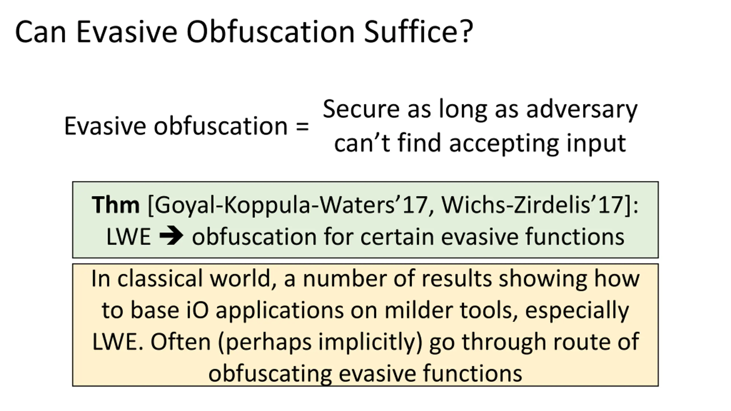 Can Evasive Obfuscation Suffice? Evasive obfuscation =Secure as long as adversary can t find accepting input Thm [Goyal-Koppula-Waters 17, Wichs-Zirdelis 17]: LWE obfuscation for certain evasive functions In classical world, a number of results showing how to base iO applications on milder tools, especially LWE. Often (perhaps implicitly) go through route of obfuscating evasive functions