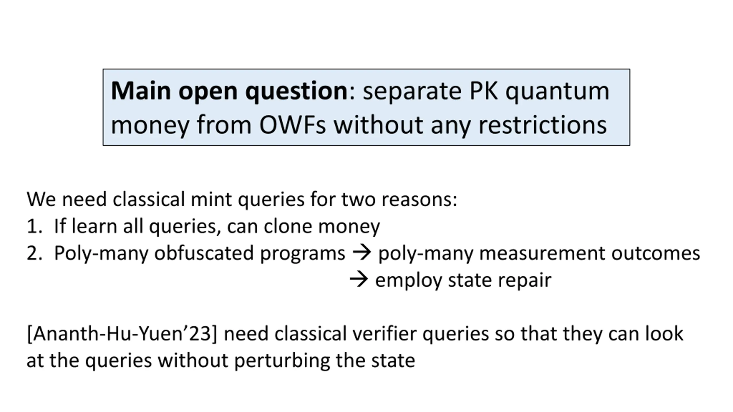 Main open question: separate PK quantum money from OWFs without any restrictions We need classical mint queries for two reasons: 1. If learn all queries, can clone money 2. Poly-many obfuscated programs poly-many measurement outcomes employ state repair [Ananth-Hu-Yuen 23] need classical verifier queries so that they can look at the queries without perturbing the state