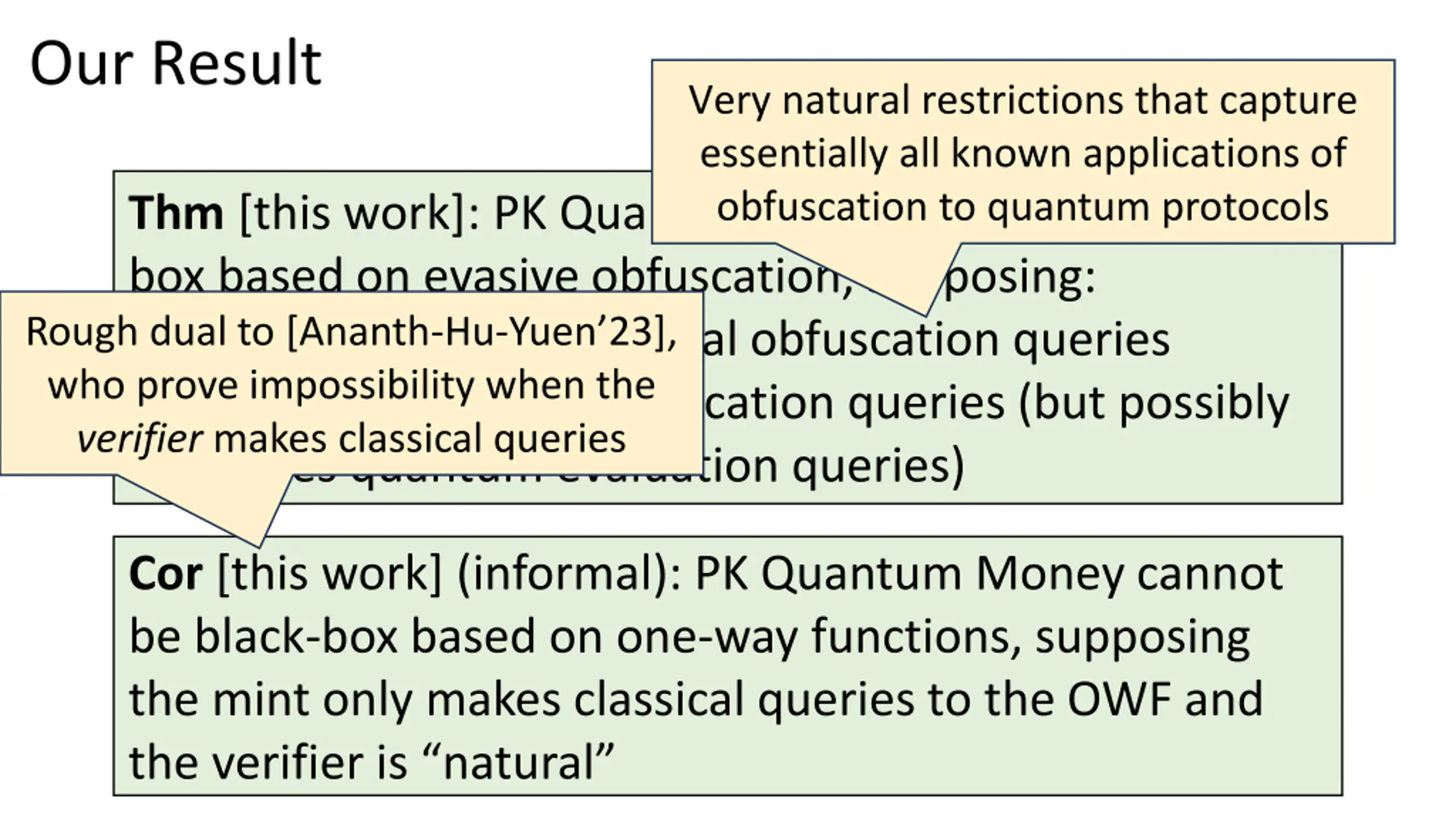 Our Result Very natural restrictions that capture essentially all known applications of obfuscation to quantum protocols Thm [this work]: PK Quantum Money cannot be black- box based on evasive obfuscation, supposing: Mint only makes classical obfuscation queries Verifier makes no obfuscation queries (but possibly makes quantum evaluation queries) Rough dual to [Ananth-Hu-Yuen 23], who prove impossibility when the verifier makes classical queries Cor [this work] (informal): PK Quantum Money cannot be black-box based on one-way functions, supposing the mint only makes classical queries to the OWF and the verifier is natural