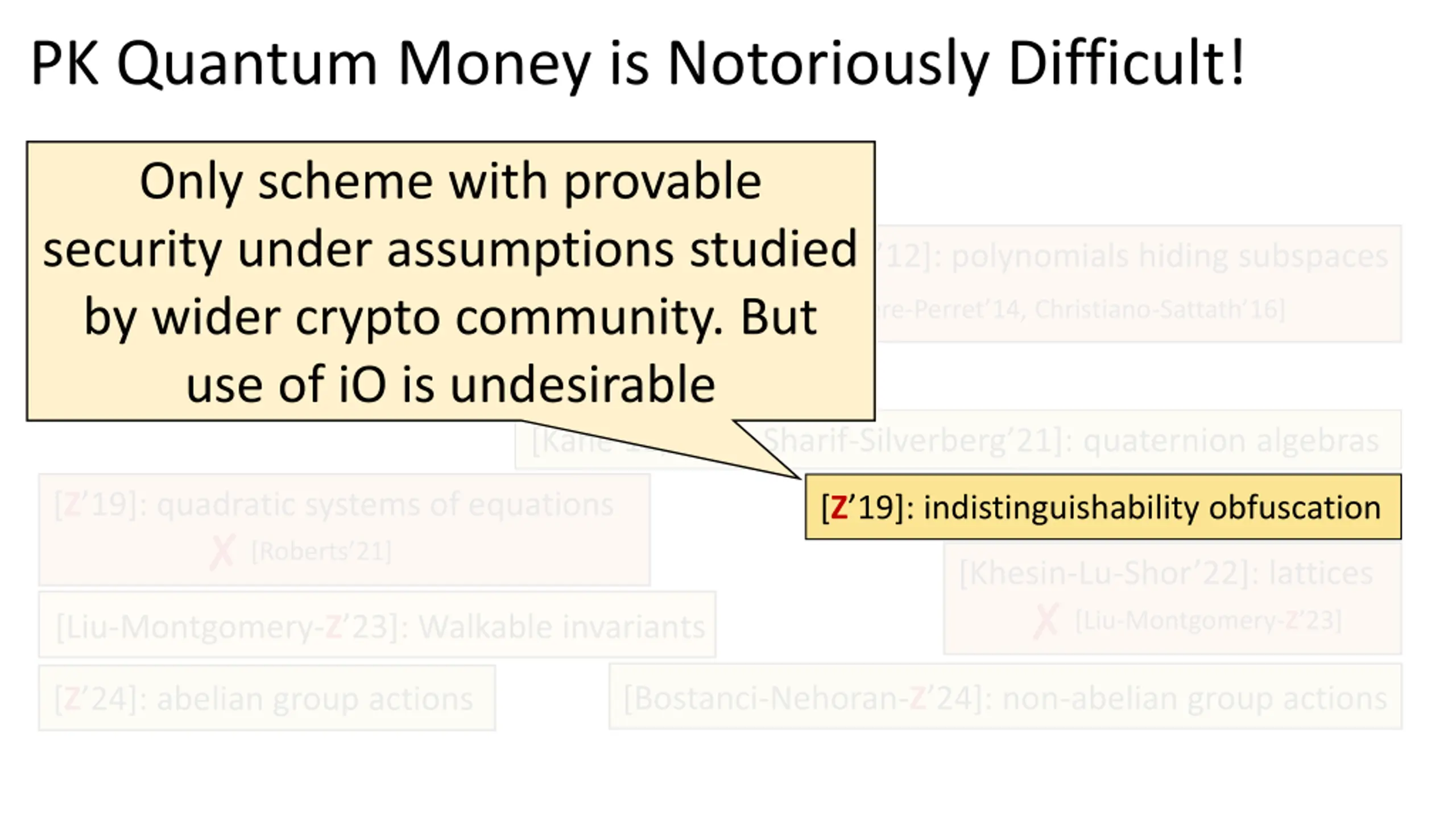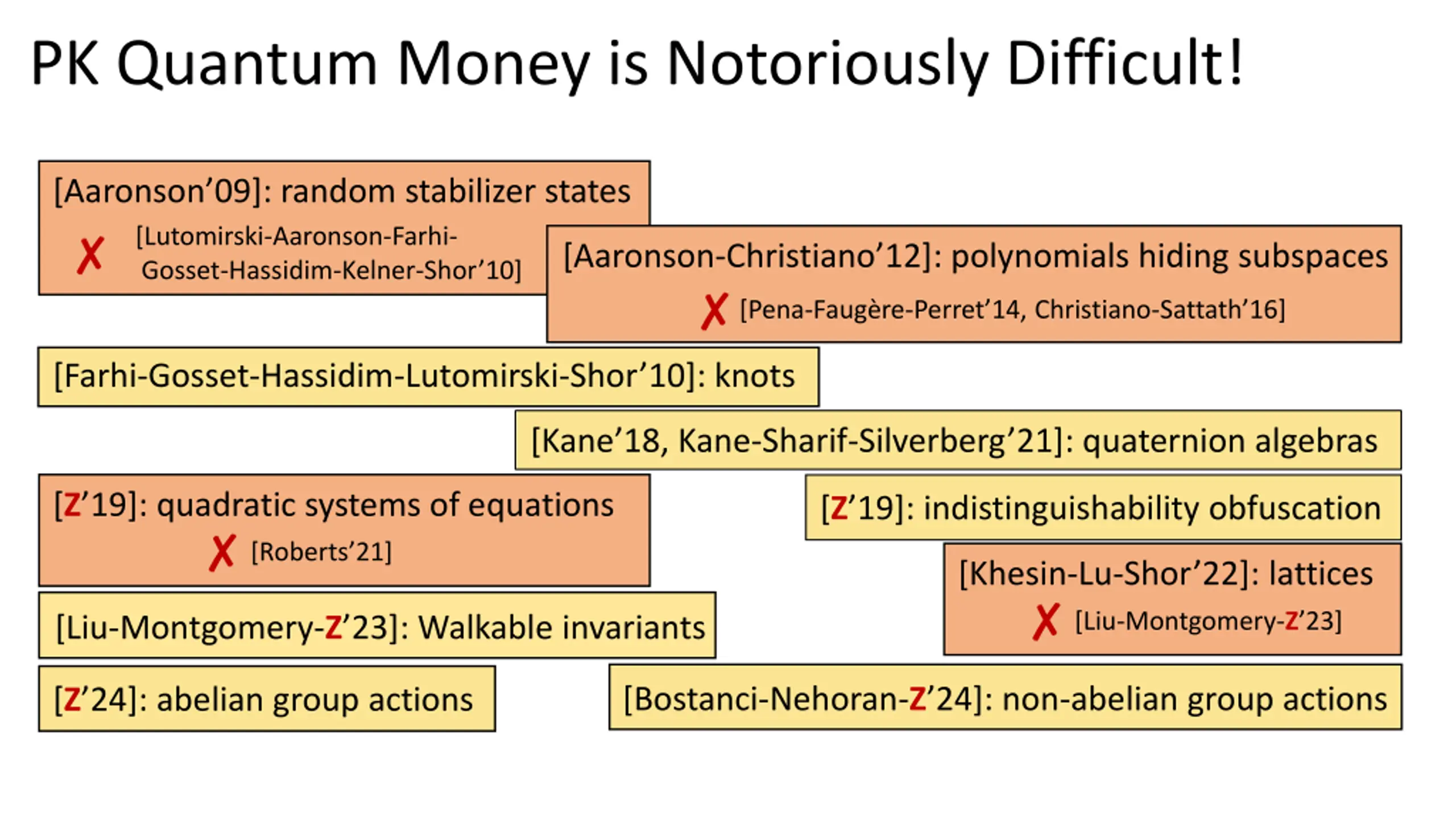 PK Quantum Money is Notoriously Difficult! [Aaronson 09]: random stabilizer states [Lutomirski-Aaronson-Farhi- Gosset-Hassidim-Kelner-Shor 10] [Aaronson-Christiano 12]: polynomials hiding subspaces [Pena-Fauge re-Perret 14, Christiano-Sattath 16] [Farhi-Gosset-Hassidim-Lutomirski-Shor 10]: knots [Kane 18, Kane-Sharif-Silverberg 21]: quaternion algebras [Z 19]: quadratic systems of equations [Z 19]: indistinguishability obfuscation [Roberts 21] [Khesin-Lu-Shor 22]: lattices [Liu-Montgomery-Z 23] [Liu-Montgomery-Z 23]: Walkable invariants [Bostanci-Nehoran-Z 24]: non-abelian group actions [Z 24]: abelian group actions
