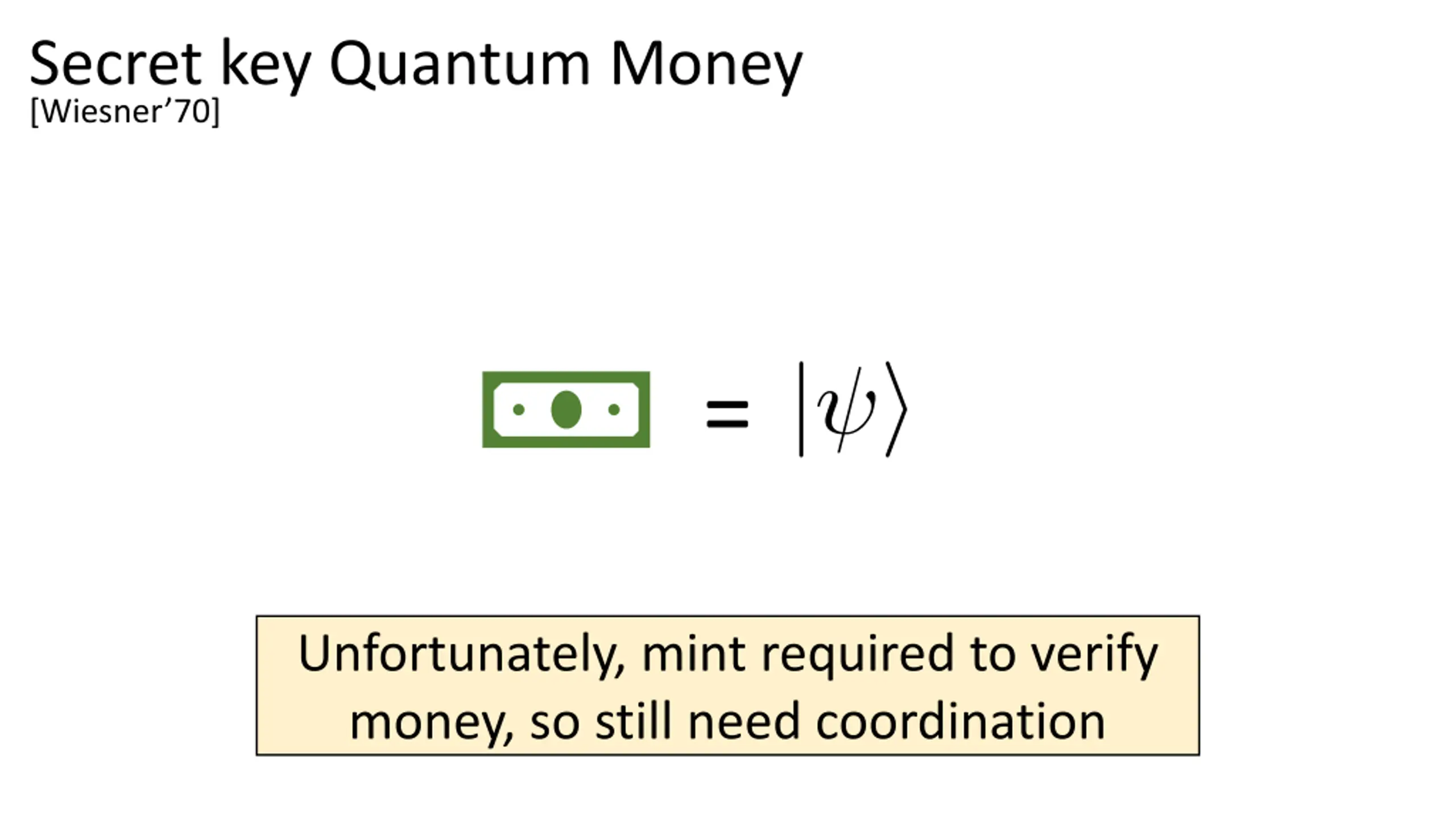 Secret key Quantum Money [Wiesner 70] = Unfortunately, mint required to verify money, so still need coordination