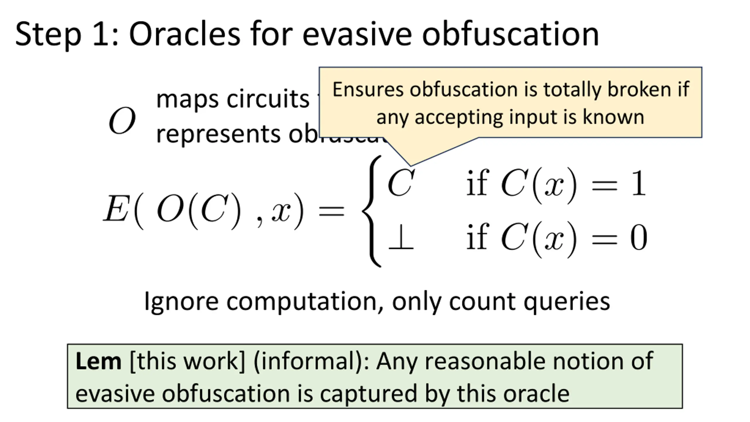 Step 1: Oracles for evasive obfuscation Ensures obfuscation is totally broken if any accepting input is known maps circuits to bit-strings, represents obfuscator Ignore computation, only count queries Lem [this work] (informal): Any reasonable notion of evasive obfuscation is captured by this oracle