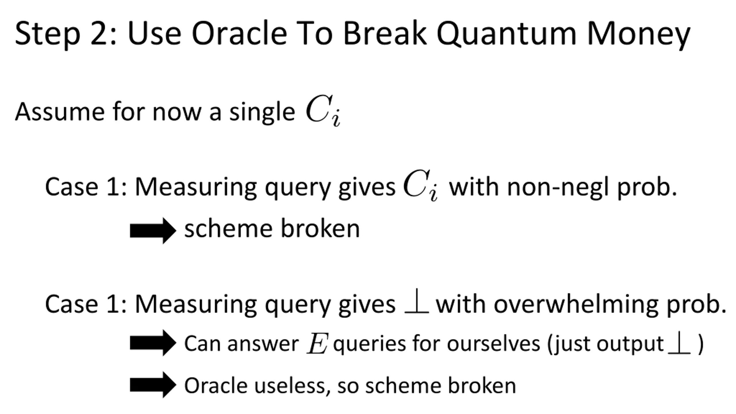 Step 2: Use Oracle To Break Quantum Money Assume for now a single Case 1: Measuring query gives with non-negl prob. scheme broken Case 1: Measuring query gives with overwhelming prob. Can answer queries for ourselves (just output ) Oracle useless, so scheme broken