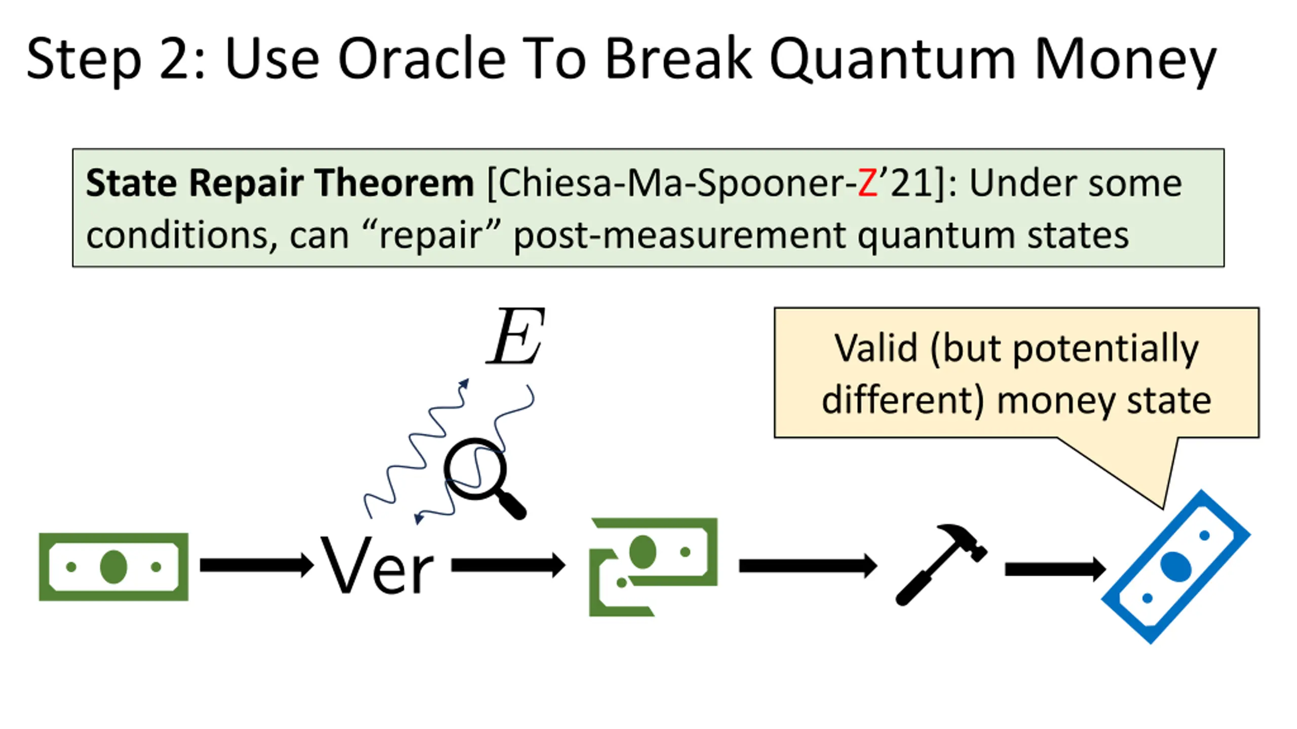 Step 2: Use Oracle To Break Quantum Money State Repair Theorem [Chiesa-Ma-Spooner-Z 21]: Under some conditions, can repair post-measurement quantum states Valid (but potentially different) money state