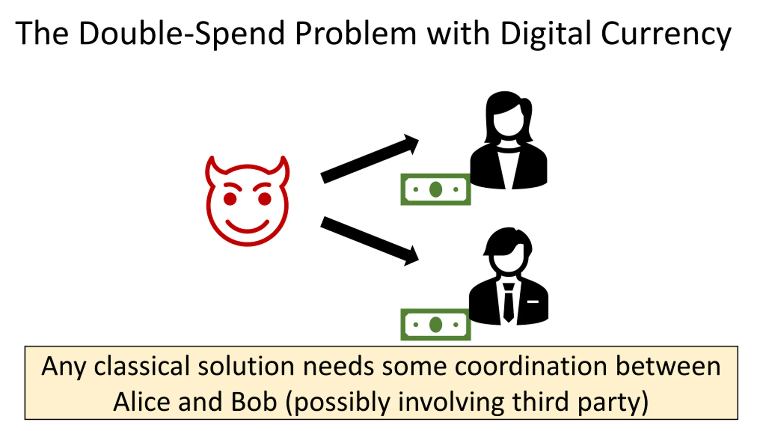 The Double-Spend Problem with Digital Currency Any classical solution needs some coordination between Alice and Bob (possibly involving third party)