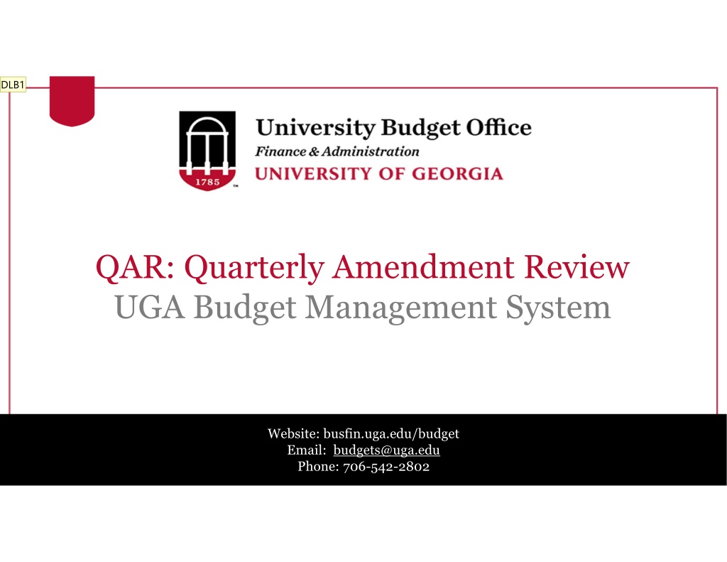 DLB1 QAR: Quarterly Amendment Review UGA Budget Management System Website: busfin.uga.edu/budget Email: budgets@uga.edu Phone: 706-542-2802 website: onesource.uga.edu email: onesource@uga.edu service desk: 706-542-0202