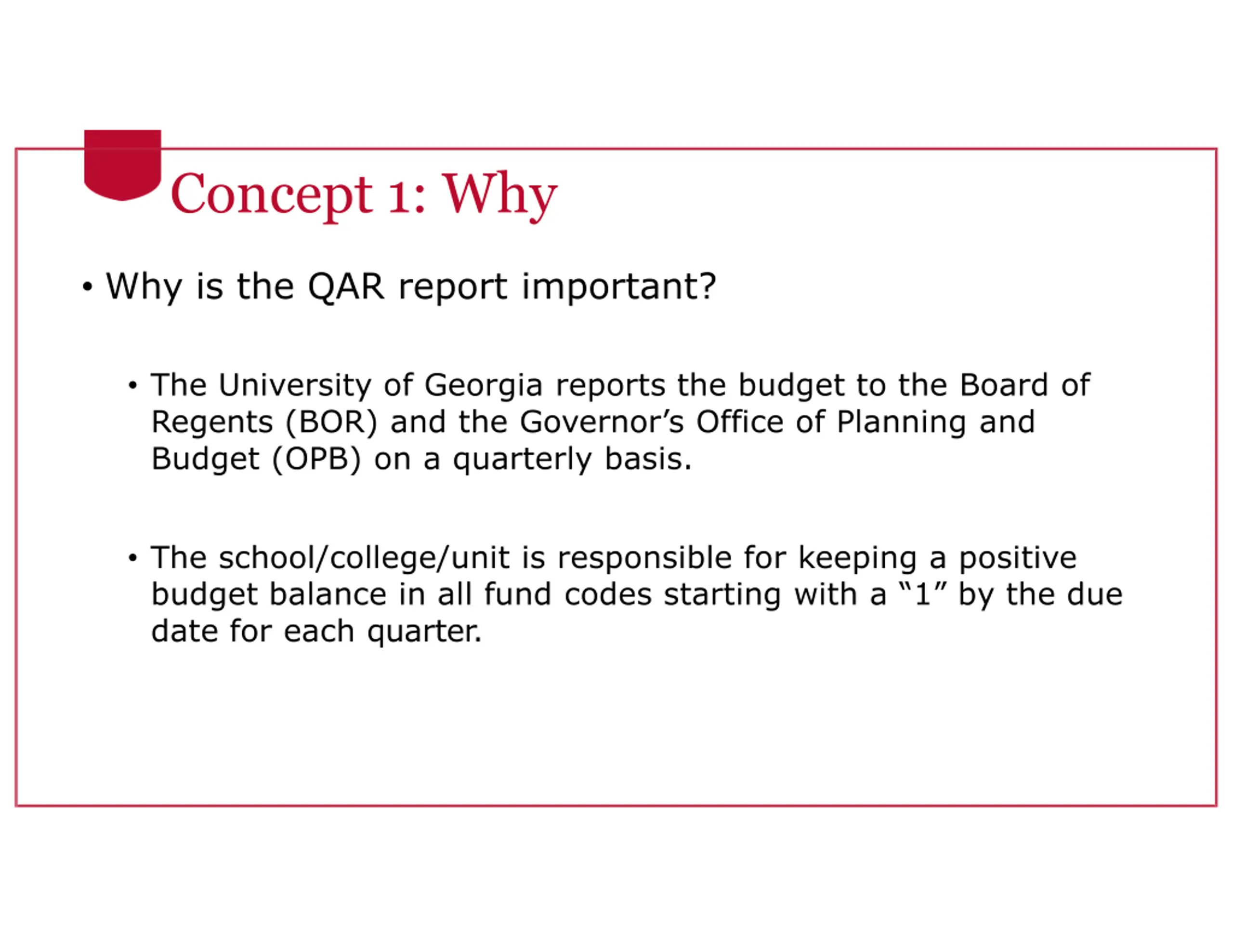 Concept 1: Why Why is the QAR report important? The University of Georgia reports the budget to the Board of Regents (BOR) and the Governor s Office of Planning and Budget (OPB) on a quarterly basis. The school/college/unit is responsible for keeping a positive budget balance in all fund codes starting with a 1 by the due date for each quarter.