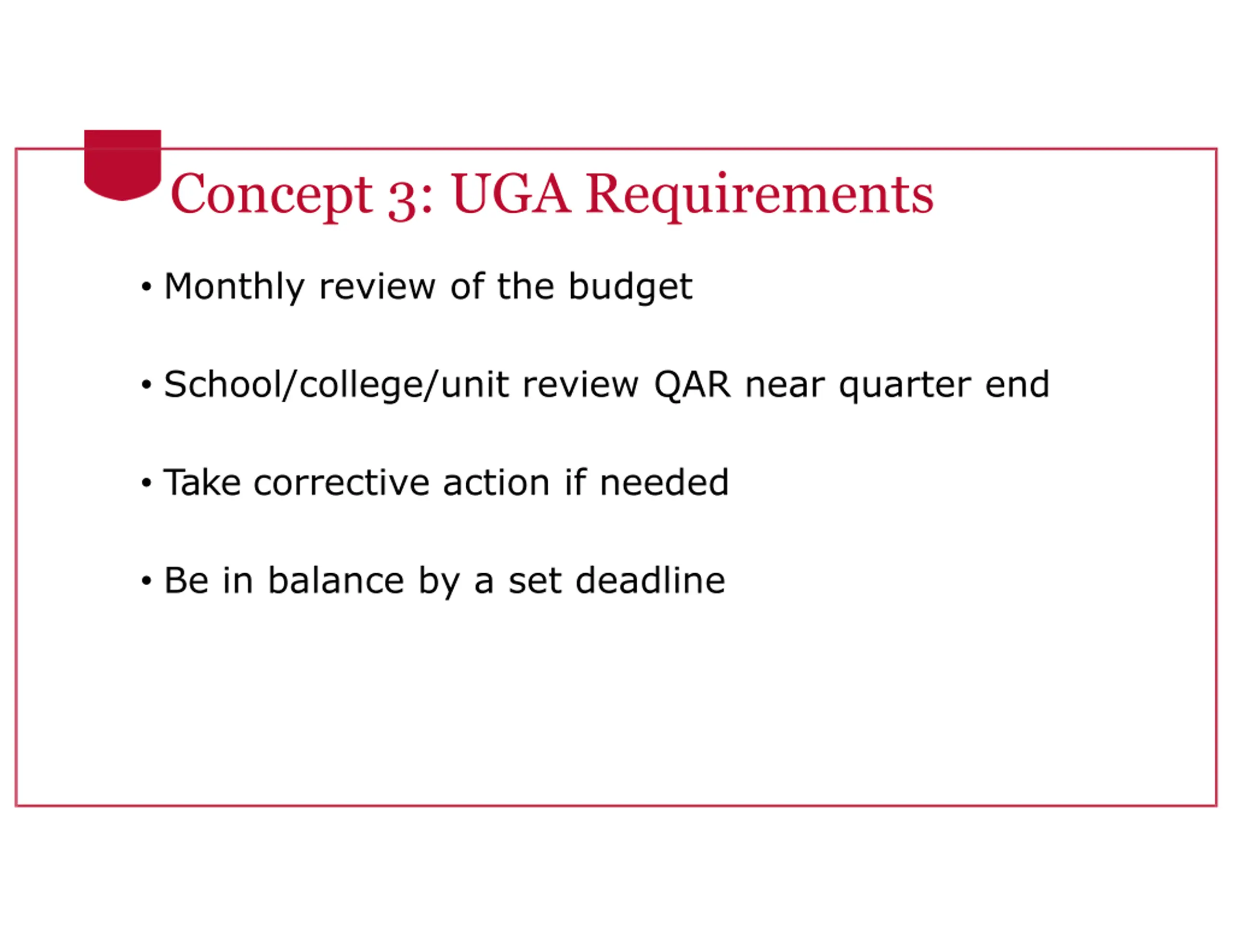 Concept 3: UGA Requirements Monthly review of the budget School/college/unit review QAR near quarter end Take corrective action if needed Be in balance by a set deadline