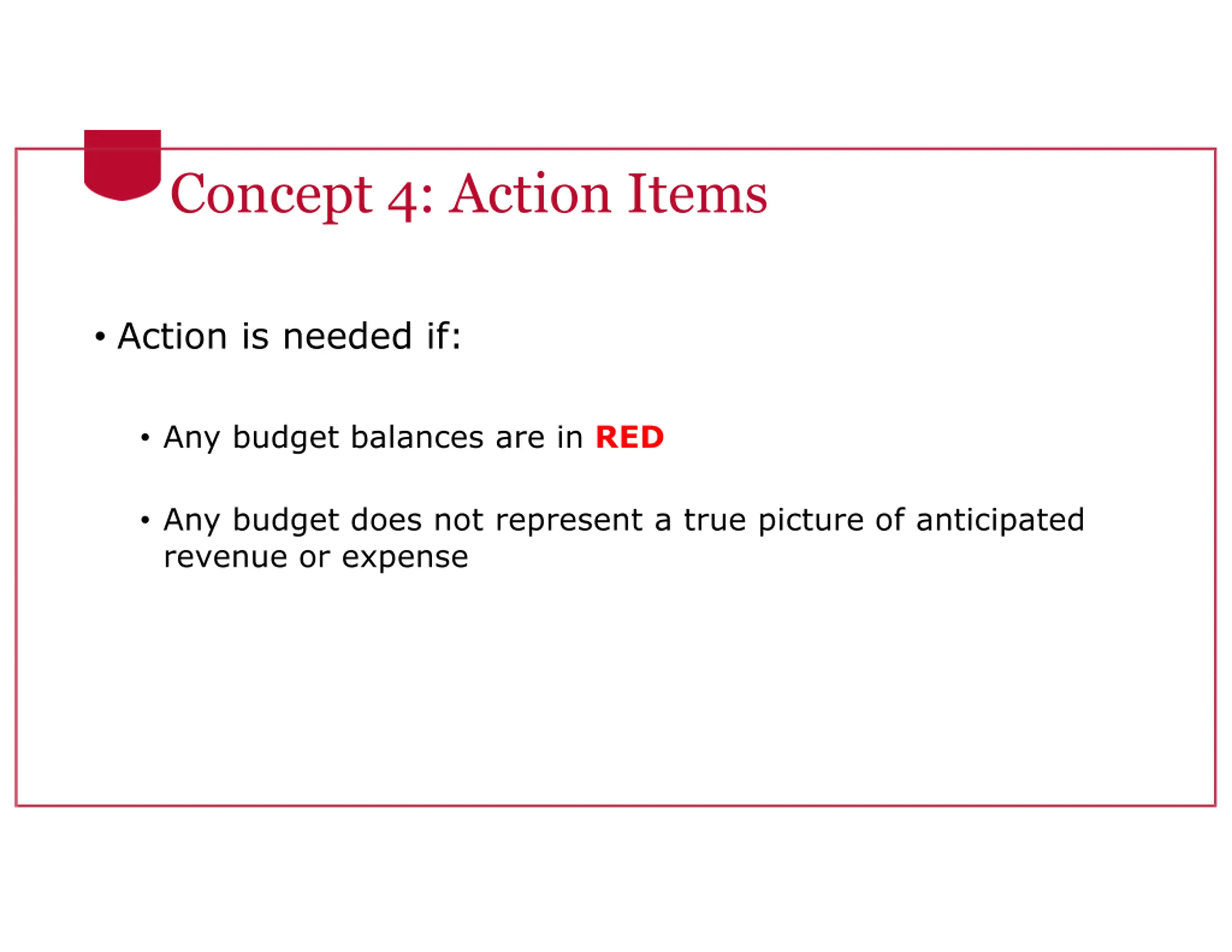 Concept 4: Action Items Action is needed if: Any budget balances are in RED Any budget does not represent a true picture of anticipated revenue or expense