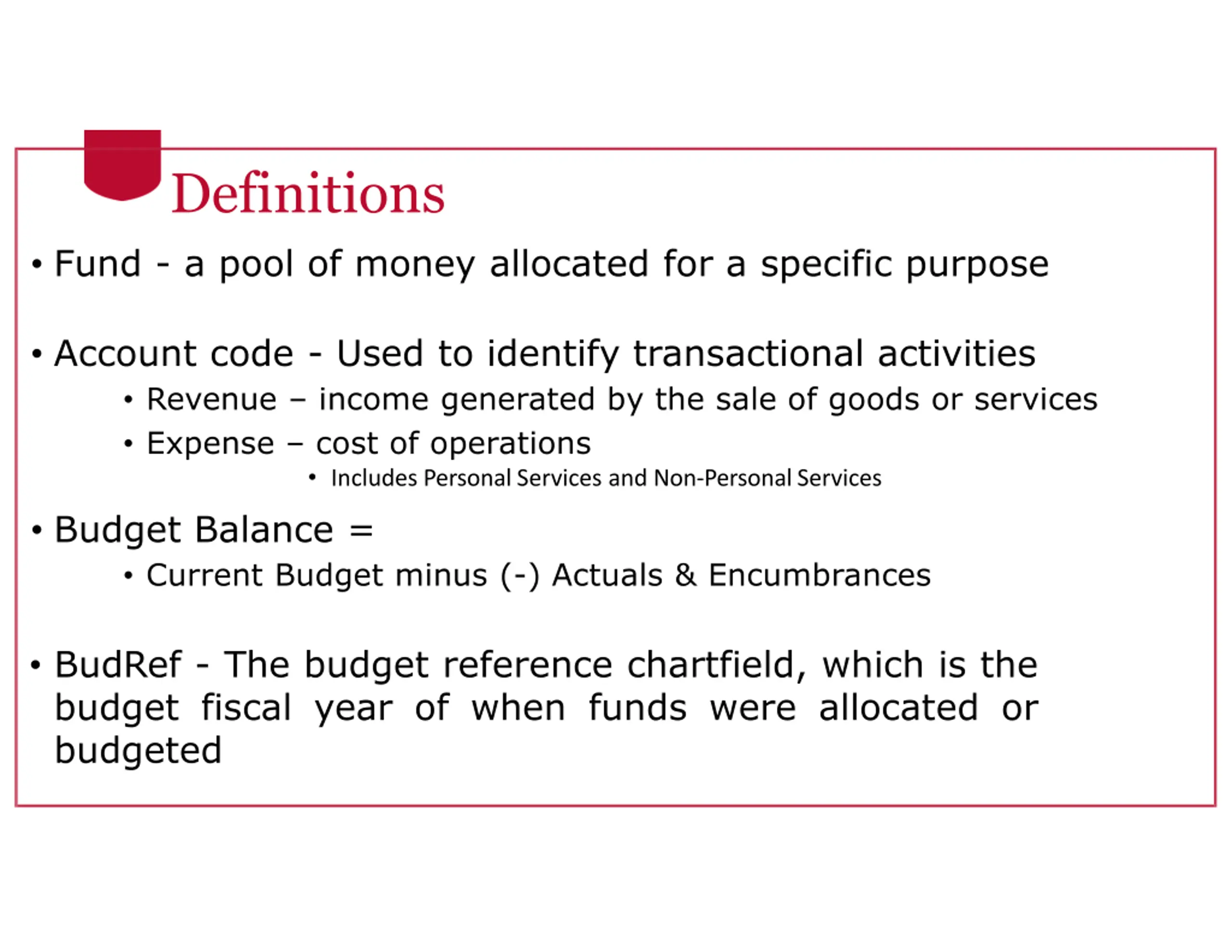 Definitions Fund - a pool of money allocated for a specific purpose Account code - Used to identify transactional activities Revenue income generated by the sale of goods or services Expense cost of operations Includes Personal Services and Non Personal Services Budget Balance = Current Budget minus (-) Actuals & Encumbrances BudRef - The budget reference chartfield, which is the budget fiscal year of when funds were allocated or budgeted