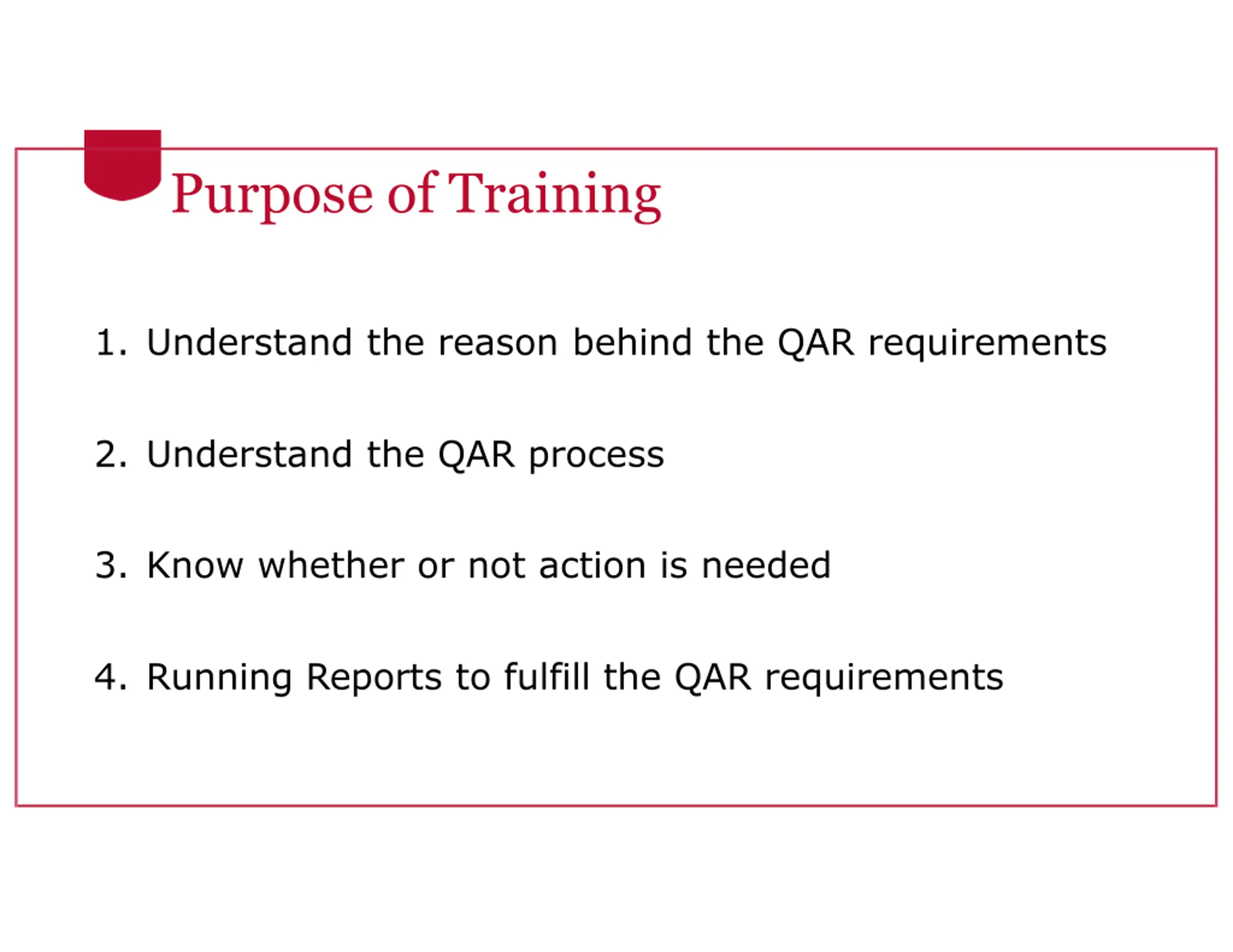 Purpose of Training 1. Understand the reason behind the QAR requirements 2. Understand the QAR process 3. Know whether or not action is needed 4. Running Reports to fulfill the QAR requirements