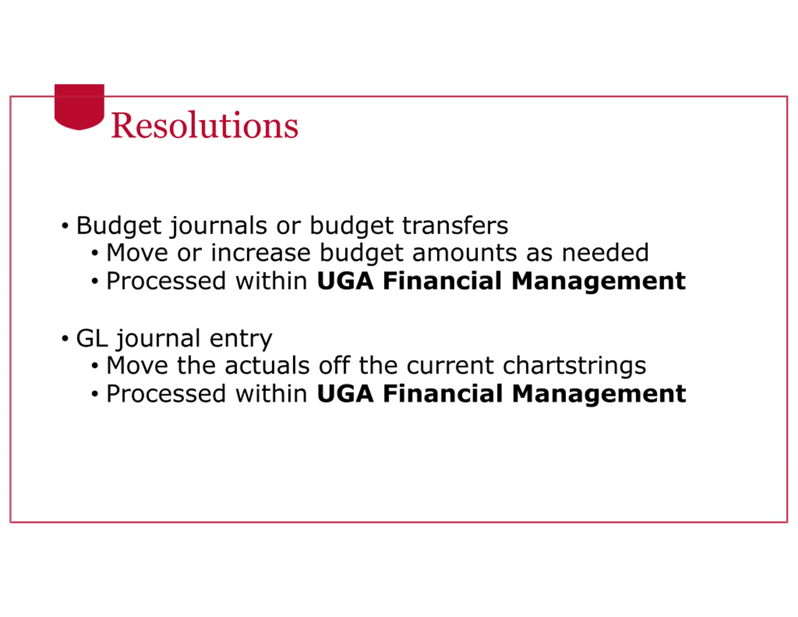 Resolutions Budget journals or budget transfers Move or increase budget amounts as needed Processed within UGA Financial Management GL journal entry Move the actuals off the current chartstrings Processed within UGA Financial Management