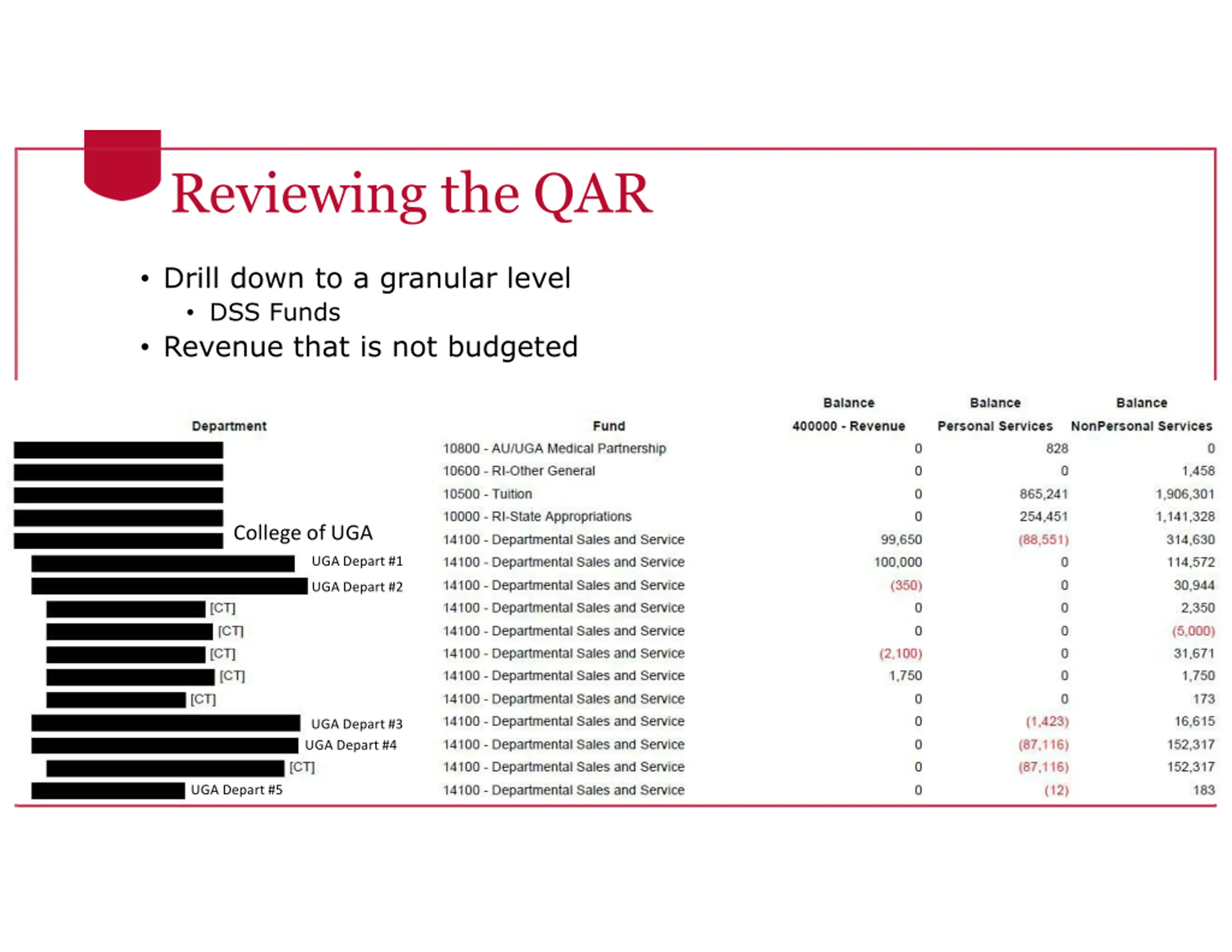Reviewing the QAR Drill down to a granular level DSS Funds Revenue that is not budgeted College of UGA UGA Depart #1 UGA Depart #2 UGA Depart #3 UGA Depart #4 UGA Depart #5