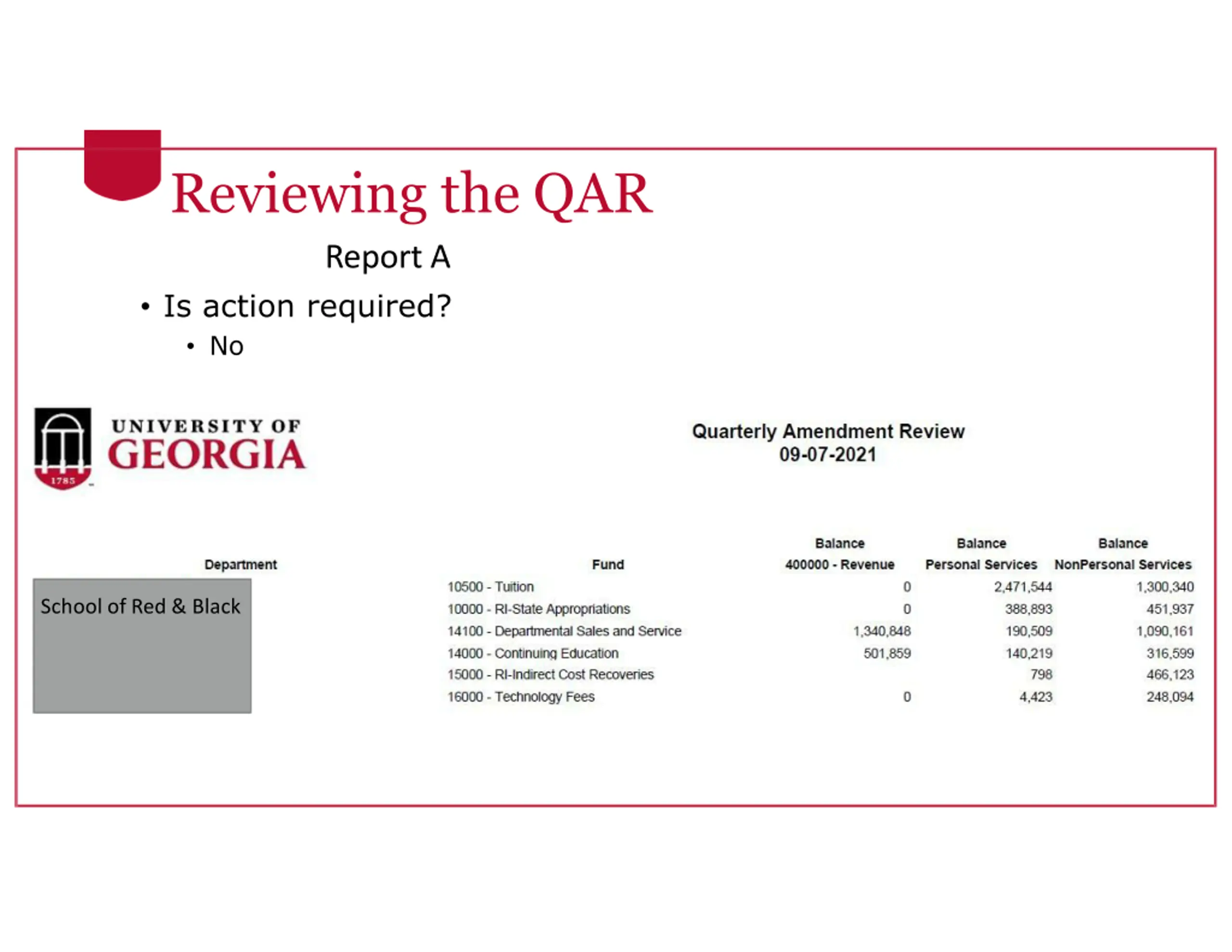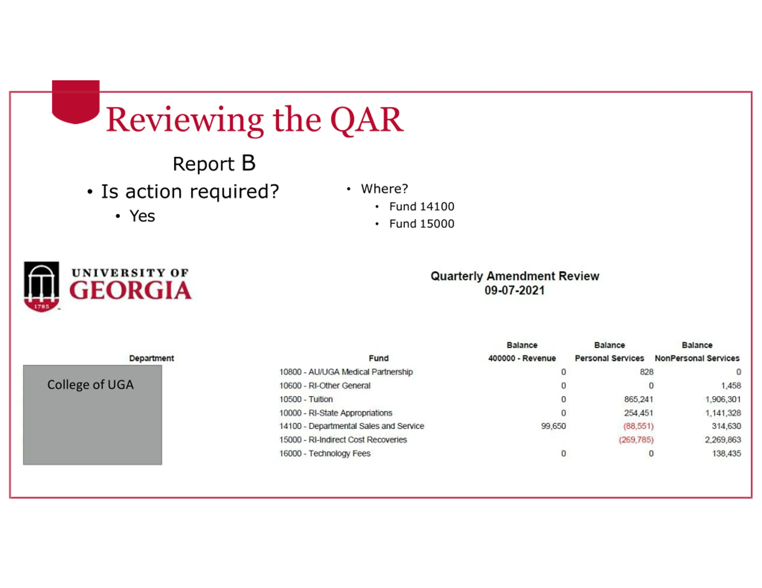 Reviewing the QAR Report B Is action required? Yes Where? Fund 14100 Fund 15000 College of UGA