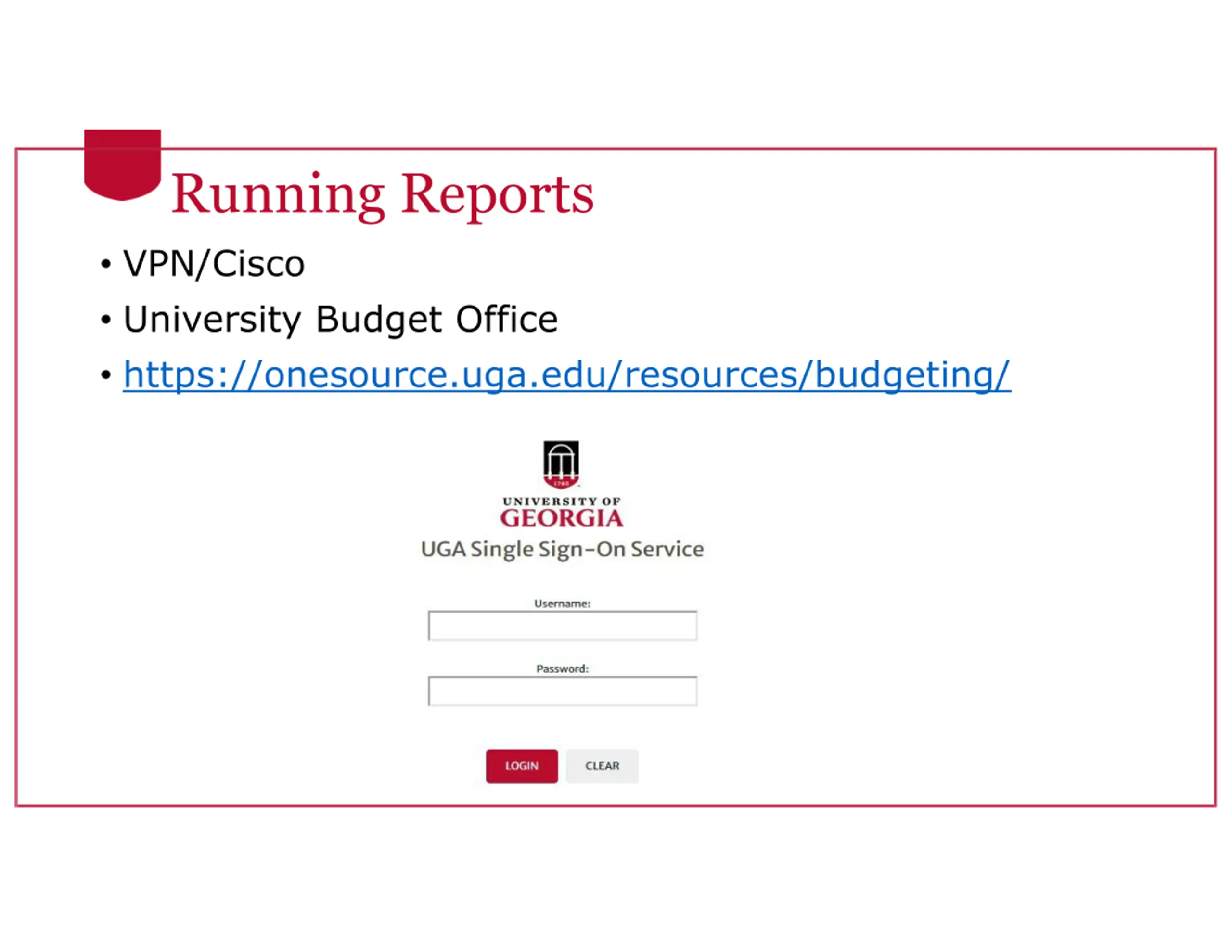 Running Reports VPN/Cisco University Budget Office https://onesource.uga.edu/resources/budgeting/