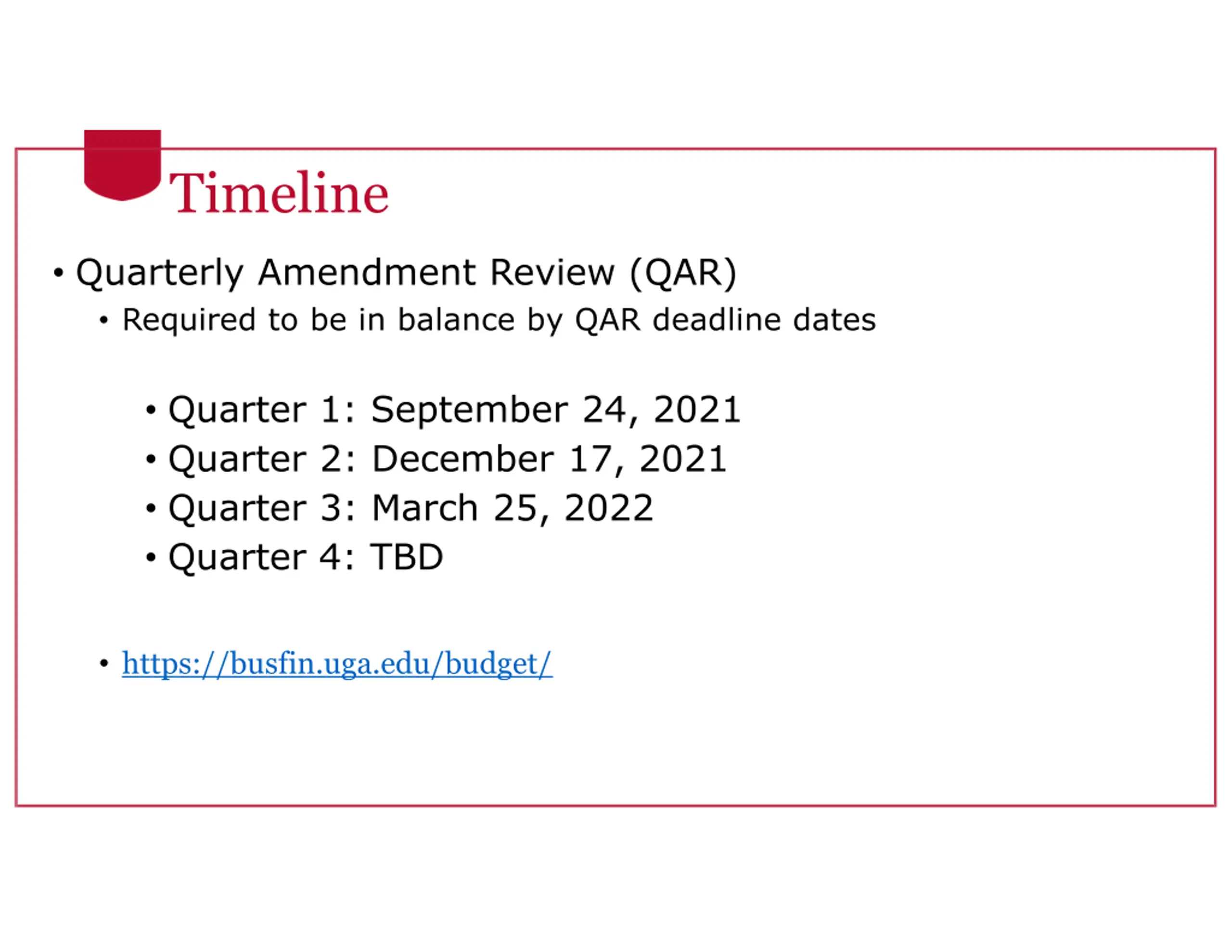 Timeline Quarterly Amendment Review (QAR) Required to be in balance by QAR deadline dates Quarter 1: September 24, 2021 Quarter 2: December 17, 2021 Quarter 3: March 25, 2022 Quarter 4: TBD https://busfin.uga.edu/budget/