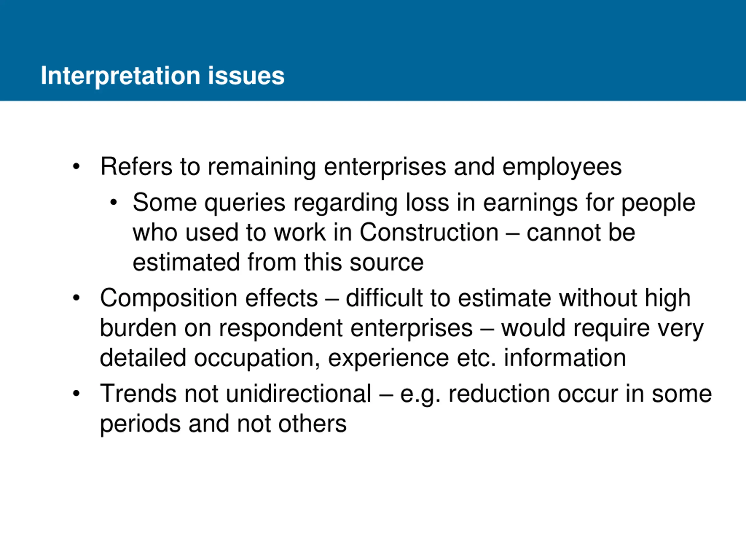 Interpretation issues Refers to remaining enterprises and employees Some queries regarding loss in earnings for people who used to work in Construction cannot be estimated from this source Composition effects difficult to estimate without high burden on respondent enterprises would require very detailed occupation, experience etc. information Trends not unidirectional e.g. reduction occur in some periods and not others