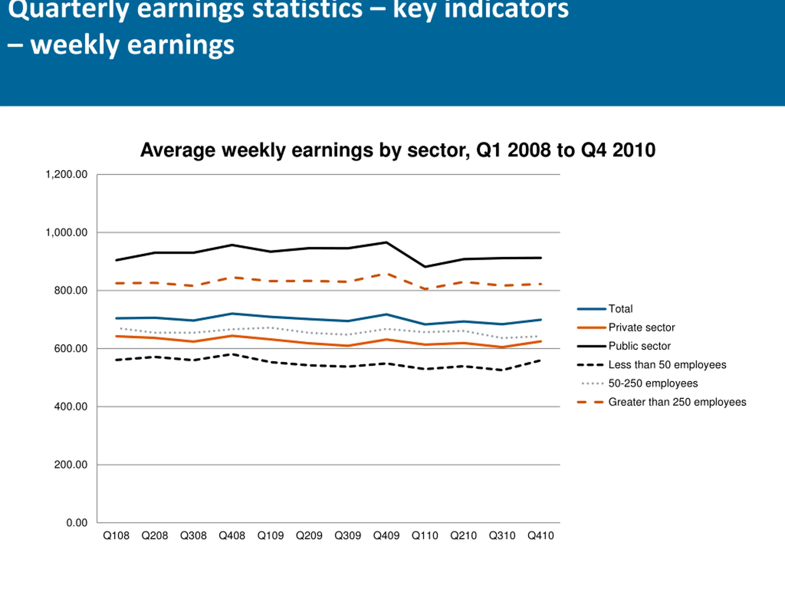 Quarterly earnings statistics key indicators weekly earnings Average weekly earnings by sector, Q1 2008 to Q4 2010 1,200.00 1,000.00 800.00 Total Private sector Public sector 600.00 Less than 50 employees 50-250 employees Greater than 250 employees 400.00 200.00 0.00 Q108 Q208 Q308 Q408 Q109 Q209 Q309 Q409 Q110 Q210 Q310 Q410