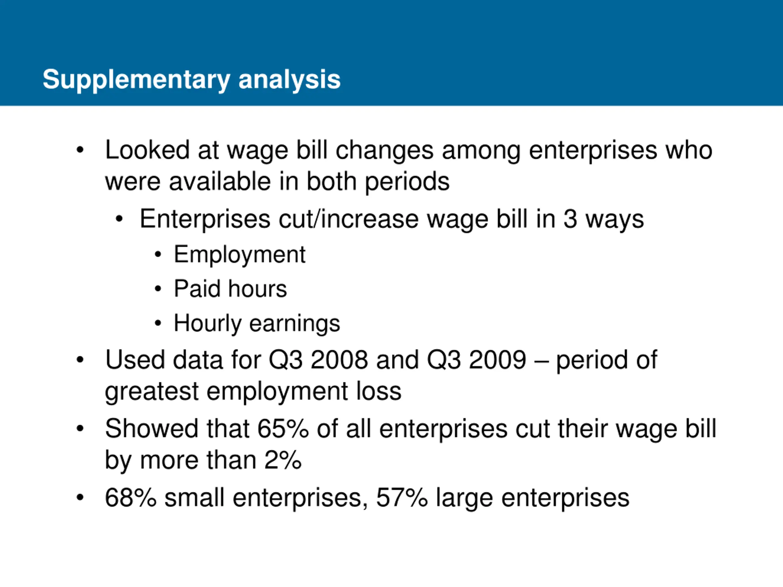 Supplementary analysis Looked at wage bill changes among enterprises who were available in both periods Enterprises cut/increase wage bill in 3 ways Employment Paid hours Hourly earnings Used data for Q3 2008 and Q3 2009 period of greatest employment loss Showed that 65% of all enterprises cut their wage bill by more than 2% 68% small enterprises, 57% large enterprises