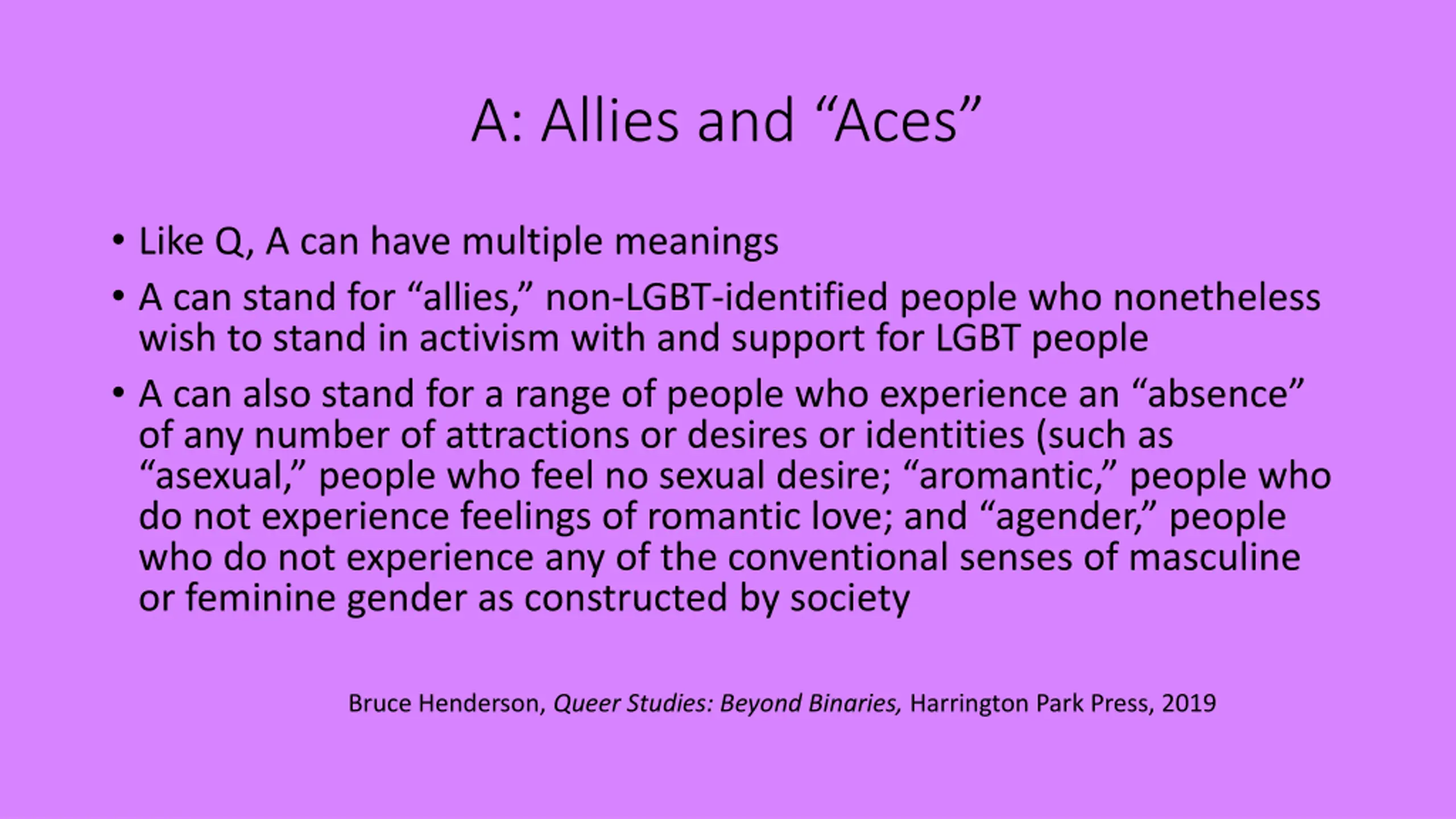 A: Allies and Aces Like Q, A can have multiple meanings A can stand for allies, non-LGBT-identified people who nonetheless wish to stand in activism with and support for LGBT people A can also stand for a range of people who experience an absence of any number of attractions or desires or identities (such as asexual, people who feel no sexual desire; aromantic, people who do not experience feelings of romantic love; and agender, people who do not experience any of the conventional senses of masculine or feminine gender as constructed by society Bruce Henderson, Queer Studies: Beyond Binaries, Harrington Park Press, 2019