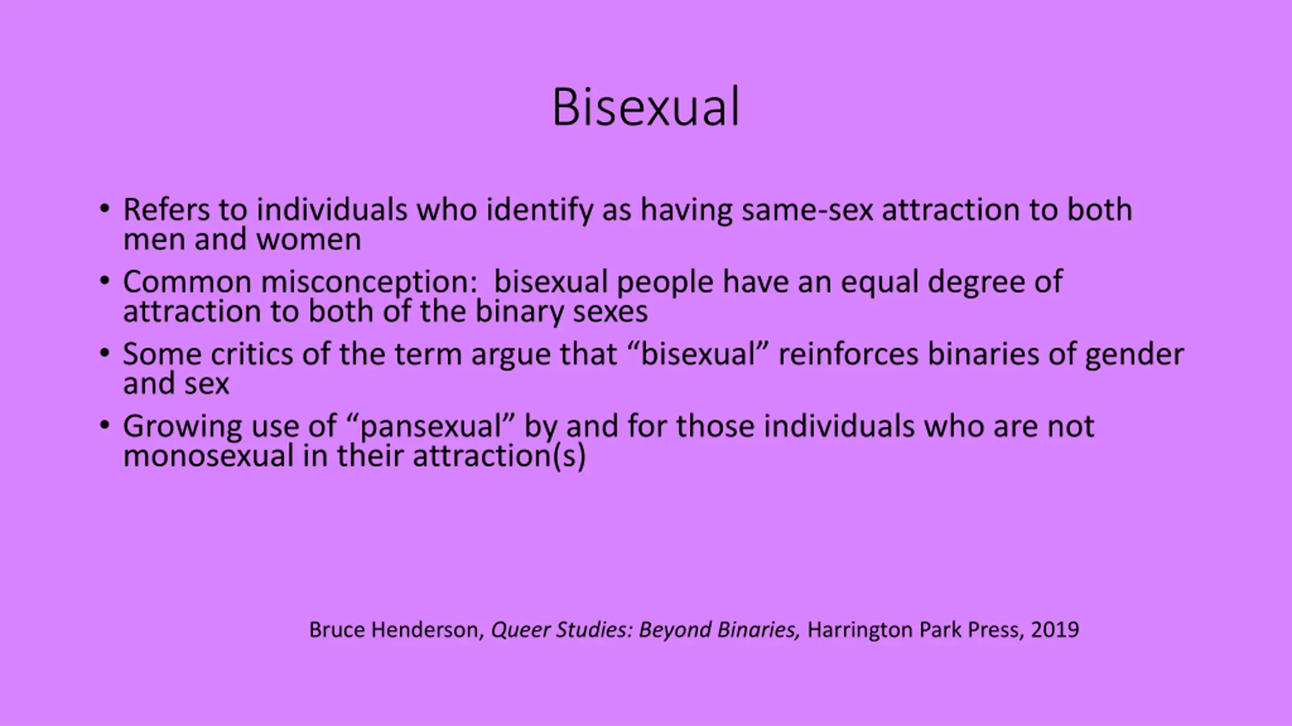 Bisexual Refers to individuals who identify as having same-sex attraction to both men and women Common misconception: bisexual people have an equal degree of attraction to both of the binary sexes Some critics of the term argue that bisexual reinforces binaries of gender and sex Growing use of pansexual by and for those individuals who are not monosexual in their attraction(s) Bruce Henderson, Queer Studies: Beyond Binaries, Harrington Park Press, 2019