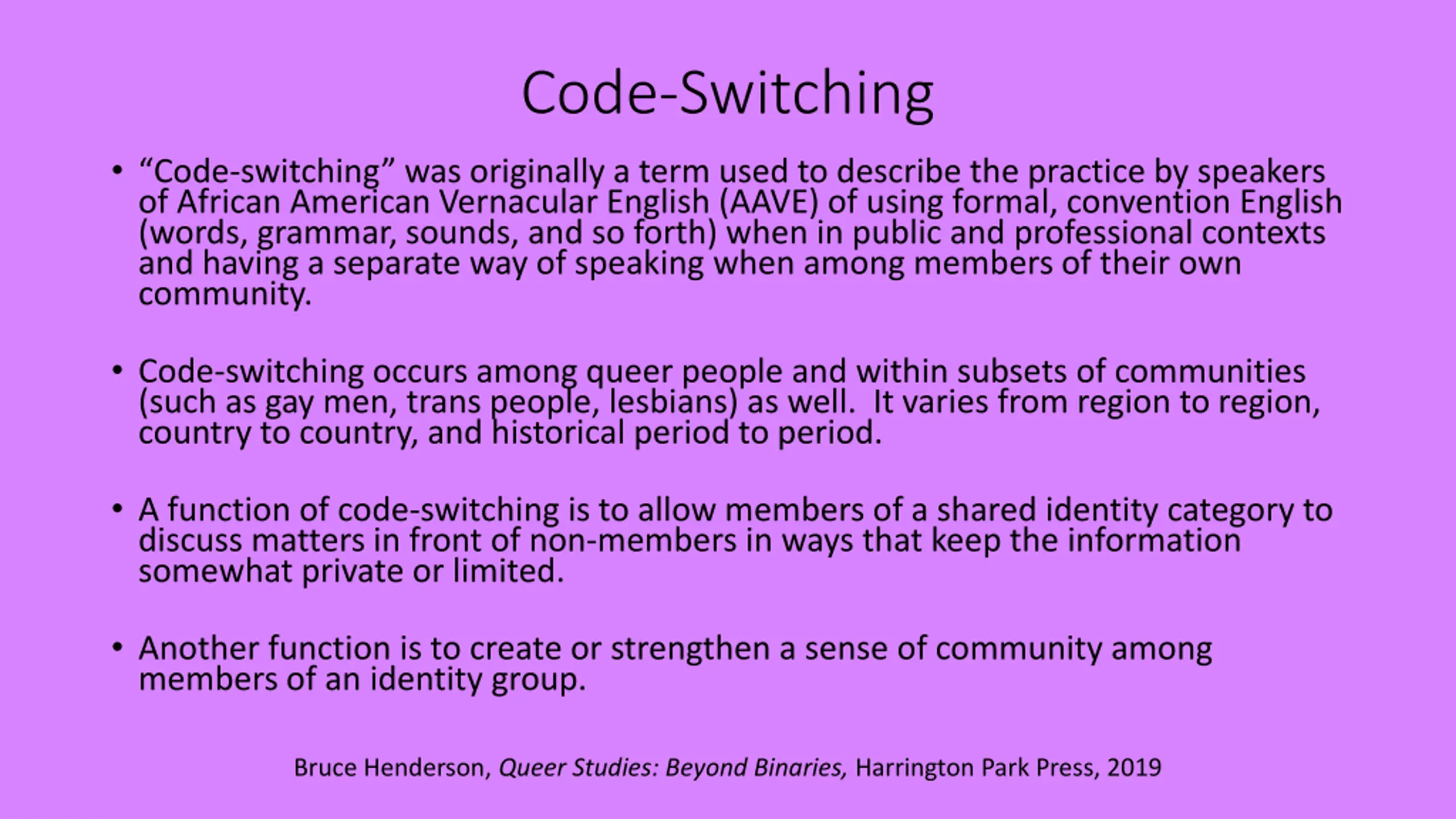 Code-Switching Code-switching was originally a term used to describe the practice by speakers of African American Vernacular English (AAVE) of using formal, convention English (words, grammar, sounds, and so forth) when in public and professional contexts and having a separate way of speaking when among members of their own community. Code-switching occurs among queer people and within subsets of communities (such as gay men, trans people, lesbians) as well. It varies from region to region, country to country, and historical period to period. A function of code-switching is to allow members of a shared identity category to discuss matters in front of non-members in ways that keep the information somewhat private or limited. Another function is to create or strengthen a sense of community among members of an identity group. Bruce Henderson, Queer Studies: Beyond Binaries, Harrington Park Press, 2019