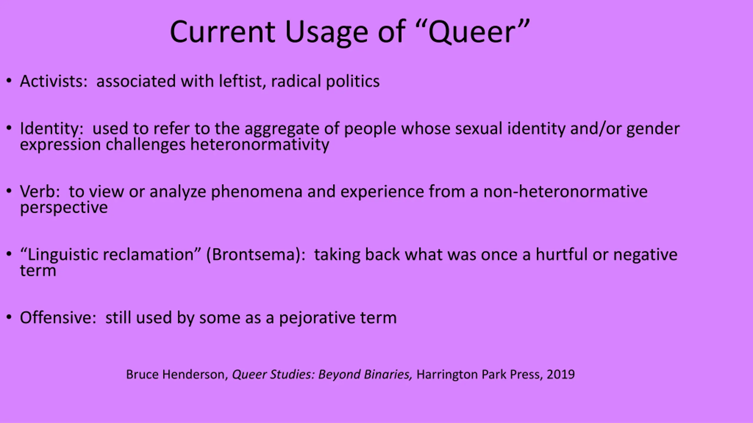 Current Usage of Queer Activists: associated with leftist, radical politics Identity: used to refer to the aggregate of people whose sexual identity and/or gender expression challenges heteronormativity Verb: to view or analyze phenomena and experience from a non-heteronormative perspective Linguistic reclamation (Brontsema): taking back what was once a hurtful or negative term Offensive: still used by some as a pejorative term Bruce Henderson, Queer Studies: Beyond Binaries, Harrington Park Press, 2019
