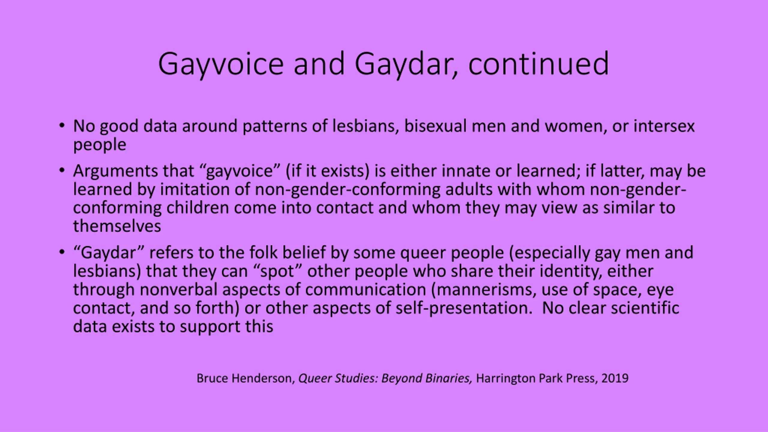 Gayvoice and Gaydar, continued No good data around patterns of lesbians, bisexual men and women, or intersex people Arguments that gayvoice (if it exists) is either innate or learned; if latter, may be learned by imitation of non-gender-conforming adults with whom non-gender- conforming children come into contact and whom they may view as similar to themselves Gaydar refers to the folk belief by some queer people (especially gay men and lesbians) that they can spot other people who share their identity, either through nonverbal aspects of communication (mannerisms, use of space, eye contact, and so forth) or other aspects of self-presentation. No clear scientific data exists to support this Bruce Henderson, Queer Studies: Beyond Binaries, Harrington Park Press, 2019
