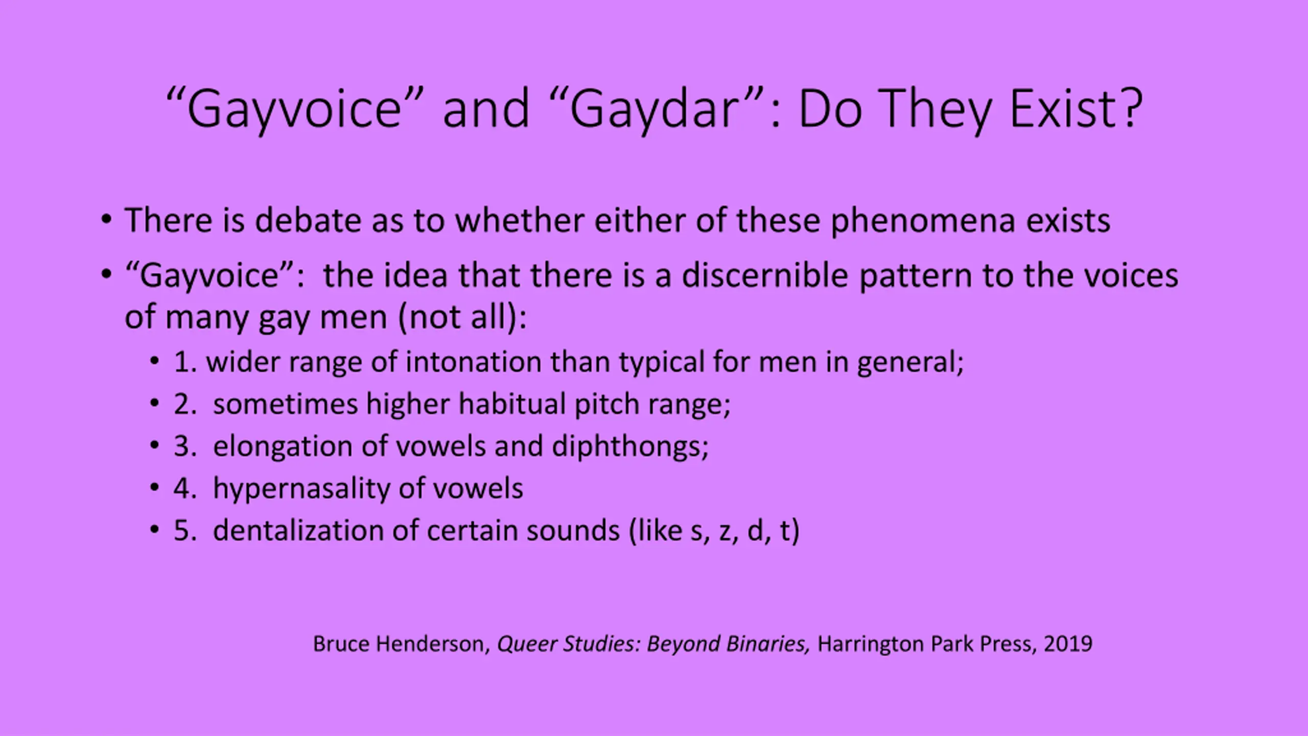 Gayvoice and Gaydar: Do They Exist? There is debate as to whether either of these phenomena exists Gayvoice : the idea that there is a discernible pattern to the voices of many gay men (not all): 1. wider range of intonation than typical for men in general; 2. sometimes higher habitual pitch range; 3. elongation of vowels and diphthongs; 4. hypernasality of vowels 5. dentalization of certain sounds (like s, z, d, t) Bruce Henderson, Queer Studies: Beyond Binaries, Harrington Park Press, 2019