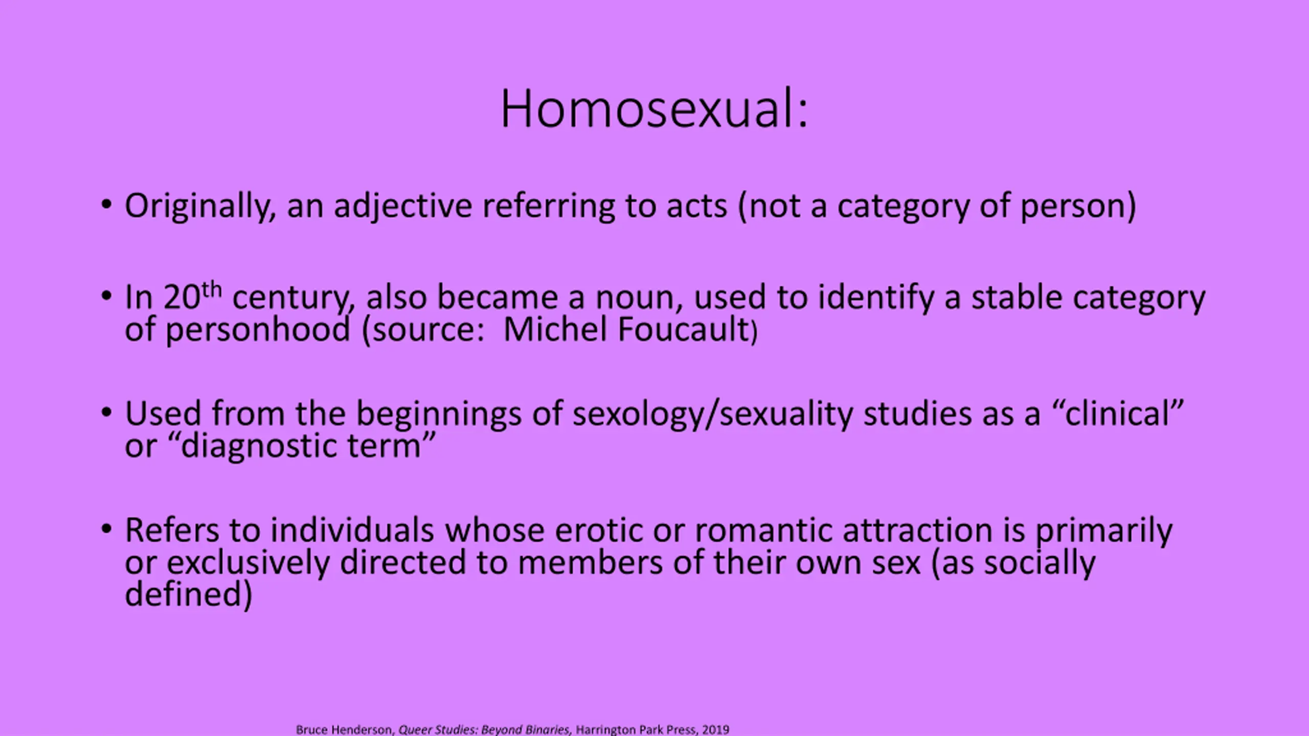 Homosexual: Originally, an adjective referring to acts (not a category of person) In 20th century, also became a noun, used to identify a stable category of personhood (source: Michel Foucault) Used from the beginnings of sexology/sexuality studies as a clinical or diagnostic term Refers to individuals whose erotic or romantic attraction is primarily or exclusively directed to members of their own sex (as socially defined) Bruce Henderson, Queer Studies: Beyond Binaries, Harrington Park Press, 2019