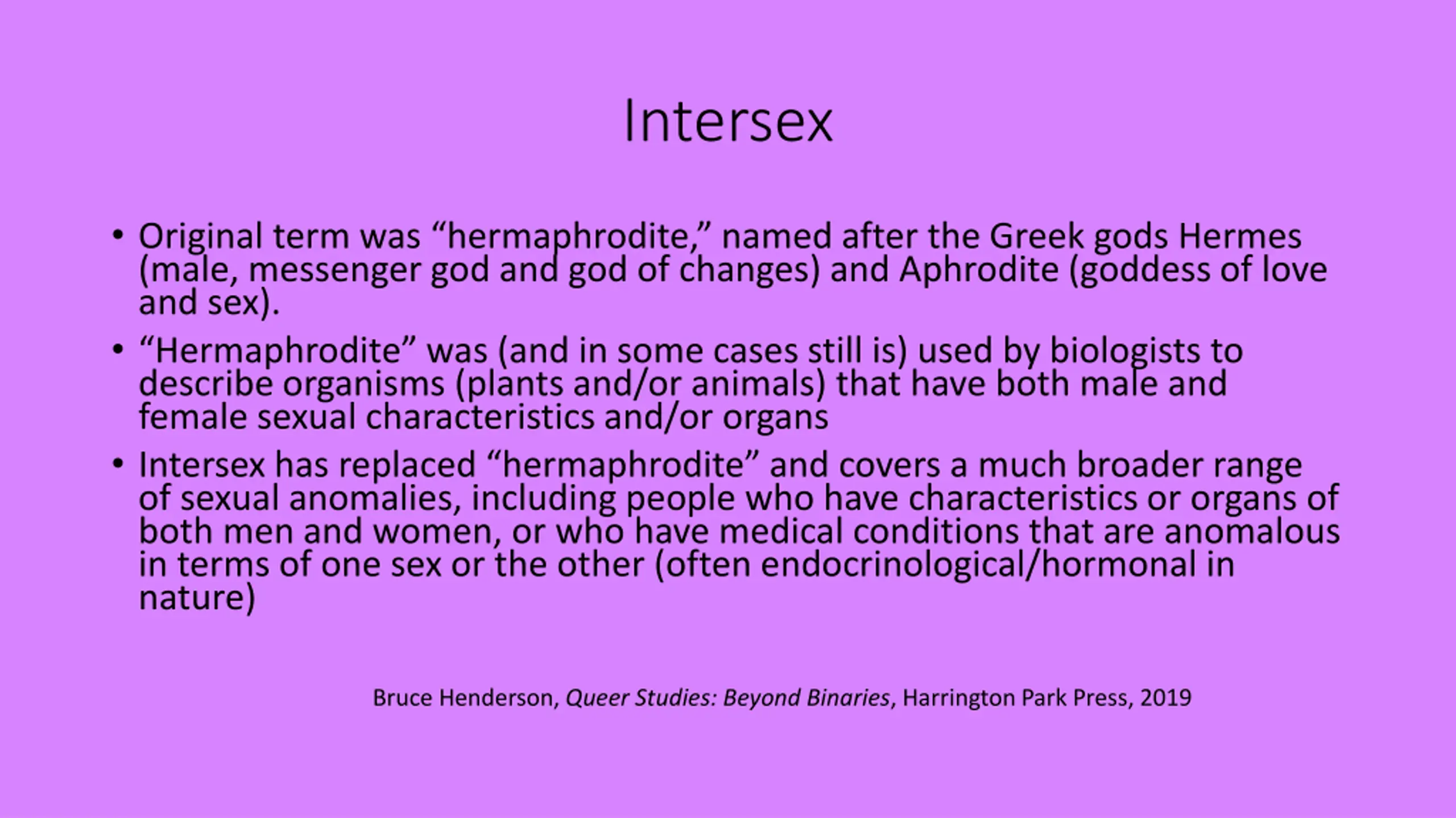 Intersex Original term was hermaphrodite, named after the Greek gods Hermes (male, messenger god and god of changes) and Aphrodite (goddess of love and sex). Hermaphrodite was (and in some cases still is) used by biologists to describe organisms (plants and/or animals) that have both male and female sexual characteristics and/or organs Intersex has replaced hermaphrodite and covers a much broader range of sexual anomalies, including people who have characteristics or organs of both men and women, or who have medical conditions that are anomalous in terms of one sex or the other (often endocrinological/hormonal in nature) Bruce Henderson, Queer Studies: Beyond Binaries, Harrington Park Press, 2019