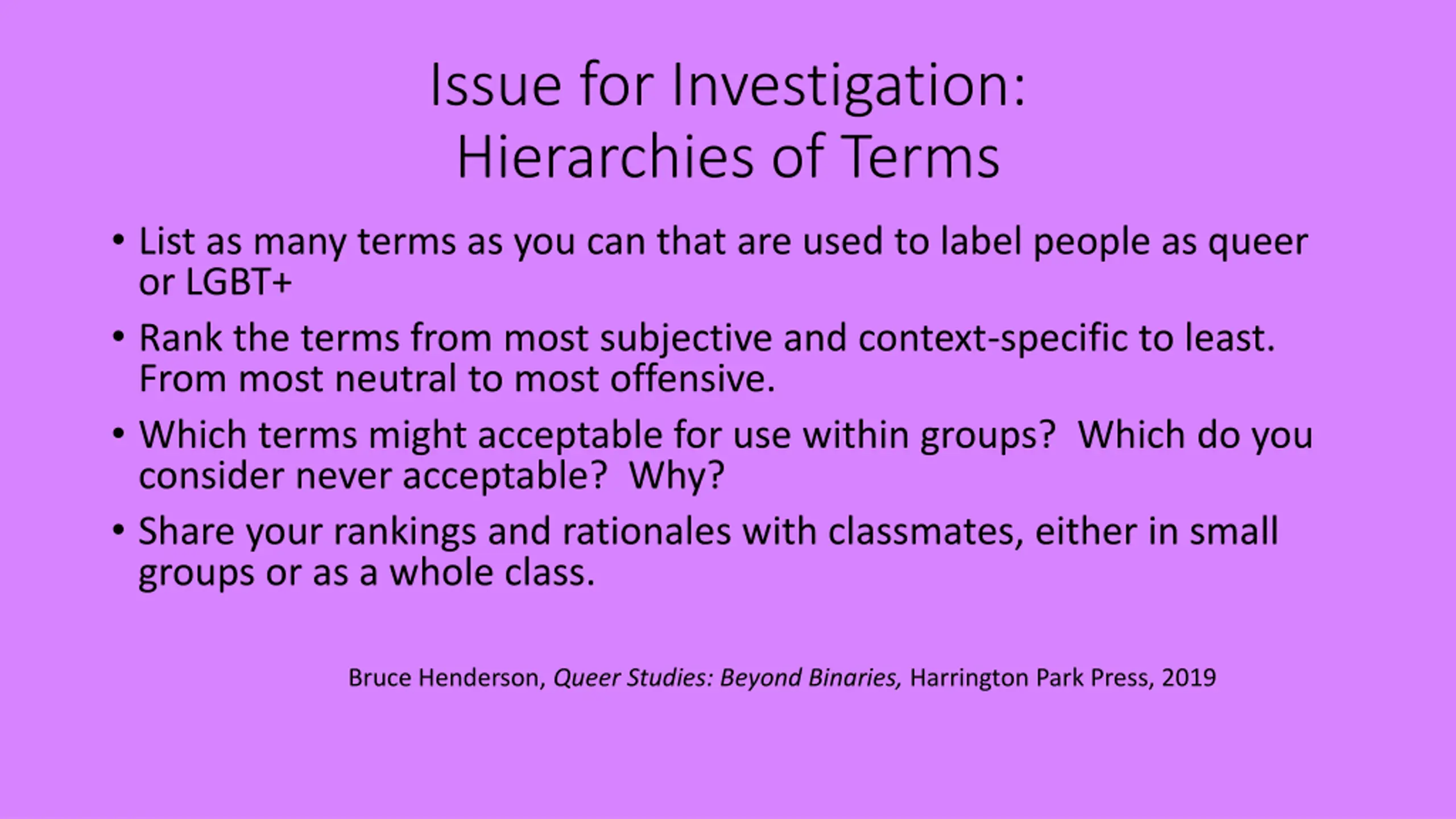Issue for Investigation: Hierarchies of Terms List as many terms as you can that are used to label people as queer or LGBT+ Rank the terms from most subjective and context-specific to least. From most neutral to most offensive. Which terms might acceptable for use within groups? Which do you consider never acceptable? Why? Share your rankings and rationales with classmates, either in small groups or as a whole class. Bruce Henderson, Queer Studies: Beyond Binaries, Harrington Park Press, 2019