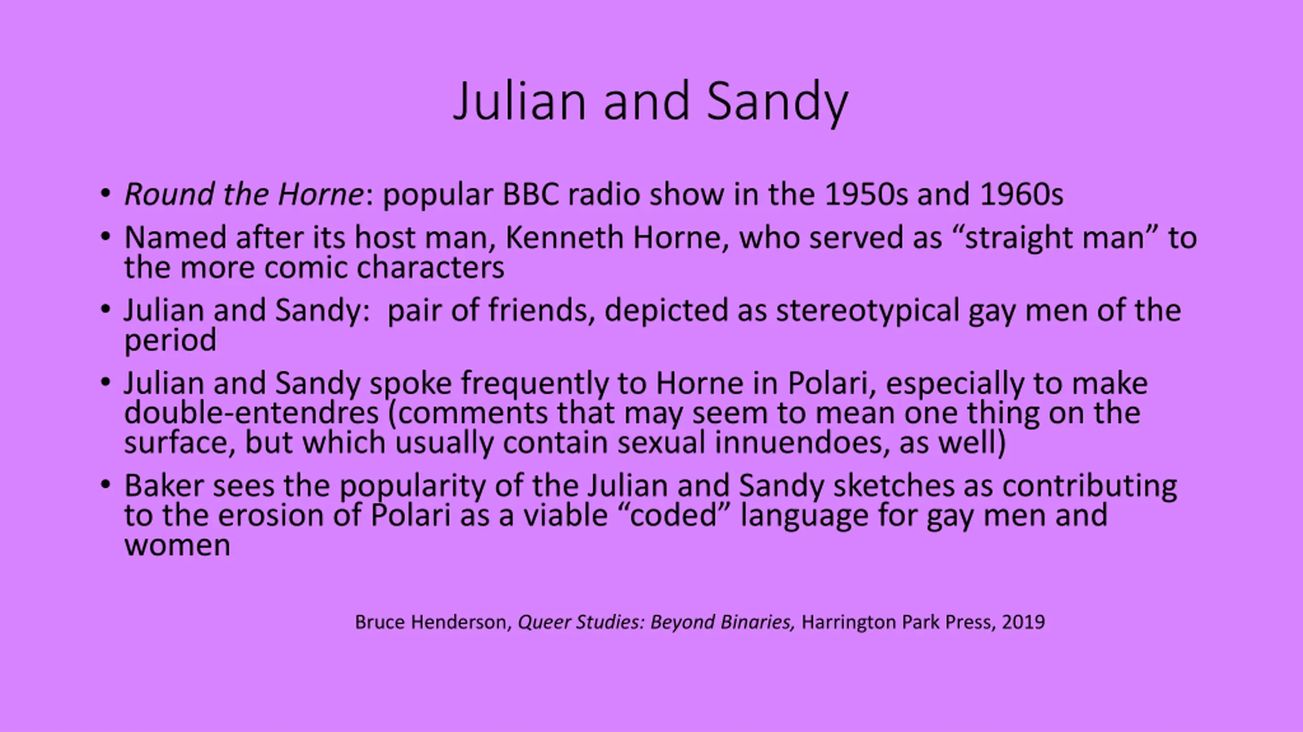 Julian and Sandy Round the Horne: popular BBC radio show in the 1950s and 1960s Named after its host man, Kenneth Horne, who served as straight man to the more comic characters Julian and Sandy: pair of friends, depicted as stereotypical gay men of the period Julian and Sandy spoke frequently to Horne in Polari, especially to make double-entendres (comments that may seem to mean one thing on the surface, but which usually contain sexual innuendoes, as well) Baker sees the popularity of the Julian and Sandy sketches as contributing to the erosion of Polari as a viable coded language for gay men and women Bruce Henderson, Queer Studies: Beyond Binaries, Harrington Park Press, 2019