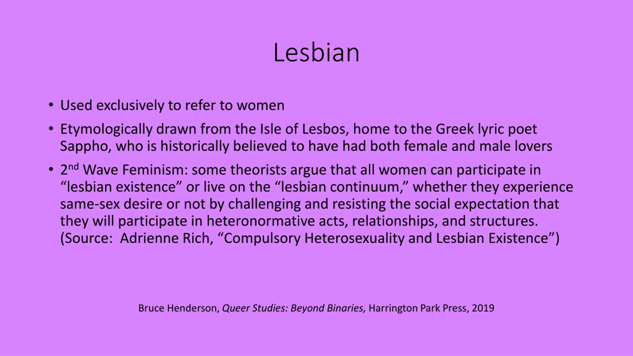 Lesbian Used exclusively to refer to women Etymologically drawn from the Isle of Lesbos, home to the Greek lyric poet Sappho, who is historically believed to have had both female and male lovers 2nd Wave Feminism: some theorists argue that all women can participate in lesbian existence or live on the lesbian continuum, whether they experience same-sex desire or not by challenging and resisting the social expectation that they will participate in heteronormative acts, relationships, and structures. (Source: Adrienne Rich, Compulsory Heterosexuality and Lesbian Existence ) Bruce Henderson, Queer Studies: Beyond Binaries, Harrington Park Press, 2019