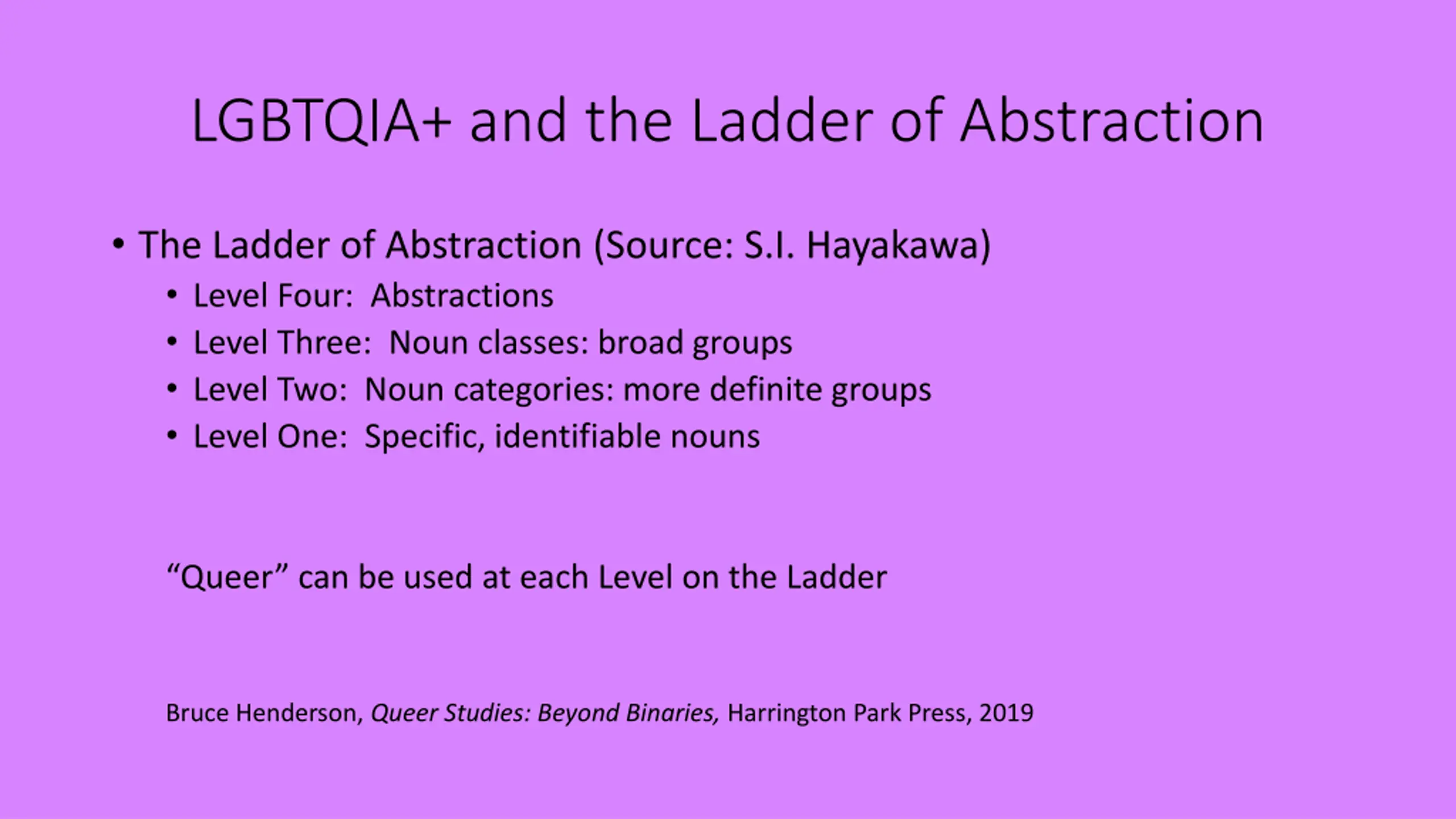 LGBTQIA+ and the Ladder of Abstraction The Ladder of Abstraction (Source: S.I. Hayakawa) Level Four: Abstractions Level Three: Noun classes: broad groups Level Two: Noun categories: more definite groups Level One: Specific, identifiable nouns Queer can be used at each Level on the Ladder Bruce Henderson, Queer Studies: Beyond Binaries, Harrington Park Press, 2019