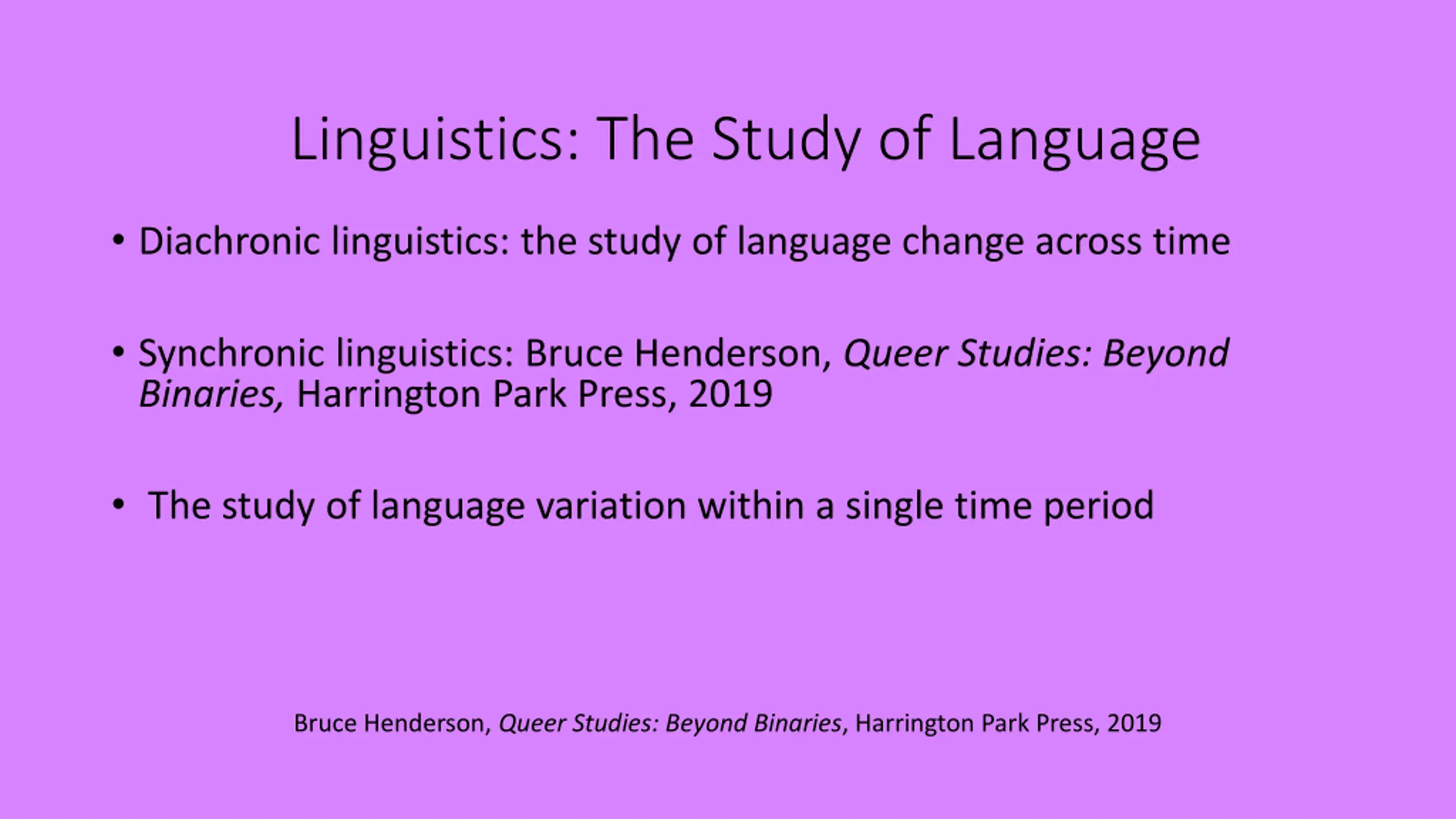 Linguistics: The Study of Language Diachronic linguistics: the study of language change across time Synchronic linguistics: Bruce Henderson, Queer Studies: Beyond Binaries, Harrington Park Press, 2019 The study of language variation within a single time period Bruce Henderson, Queer Studies: Beyond Binaries, Harrington Park Press, 2019