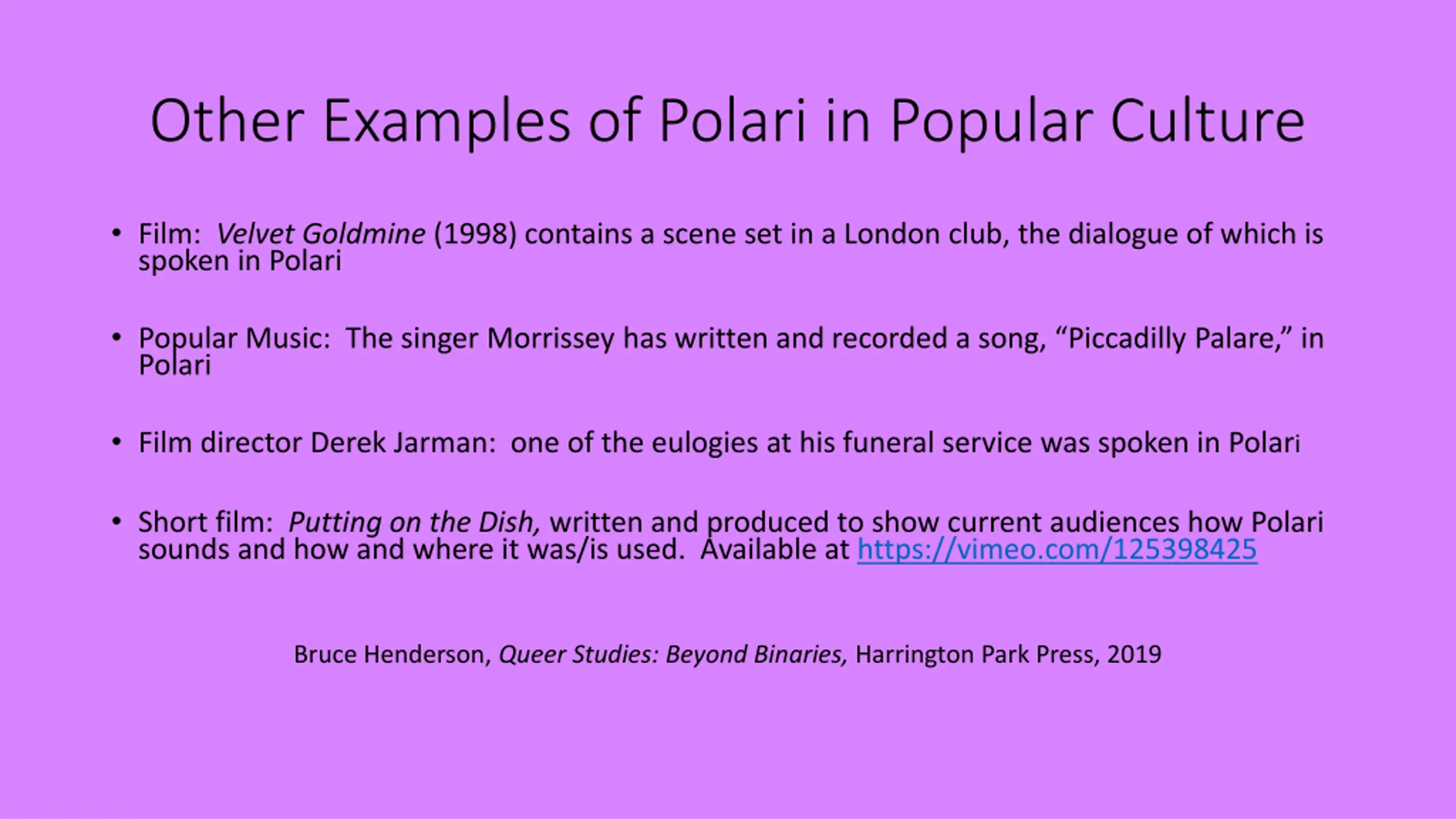 Other Examples of Polari in Popular Culture Film: Velvet Goldmine (1998) contains a scene set in a London club, the dialogue of which is spoken in Polari Popular Music: The singer Morrissey has written and recorded a song, Piccadilly Palare, in Polari Film director Derek Jarman: one of the eulogies at his funeral service was spoken in Polari Short film: Putting on the Dish, written and produced to show current audiences how Polari sounds and how and where it was/is used. Available at https://vimeo.com/125398425 Bruce Henderson, Queer Studies: Beyond Binaries, Harrington Park Press, 2019