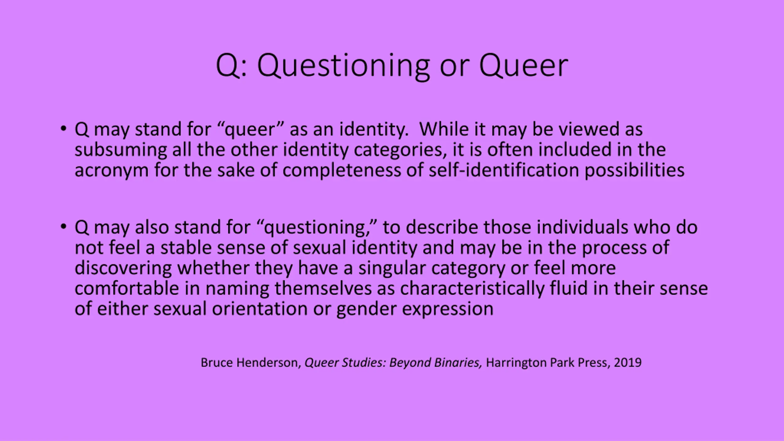 Q: Questioning or Queer Q may stand for queer as an identity. While it may be viewed as subsuming all the other identity categories, it is often included in the acronym for the sake of completeness of self-identification possibilities Q may also stand for questioning, to describe those individuals who do not feel a stable sense of sexual identity and may be in the process of discovering whether they have a singular category or feel more comfortable in naming themselves as characteristically fluid in their sense of either sexual orientation or gender expression Bruce Henderson, Queer Studies: Beyond Binaries, Harrington Park Press, 2019
