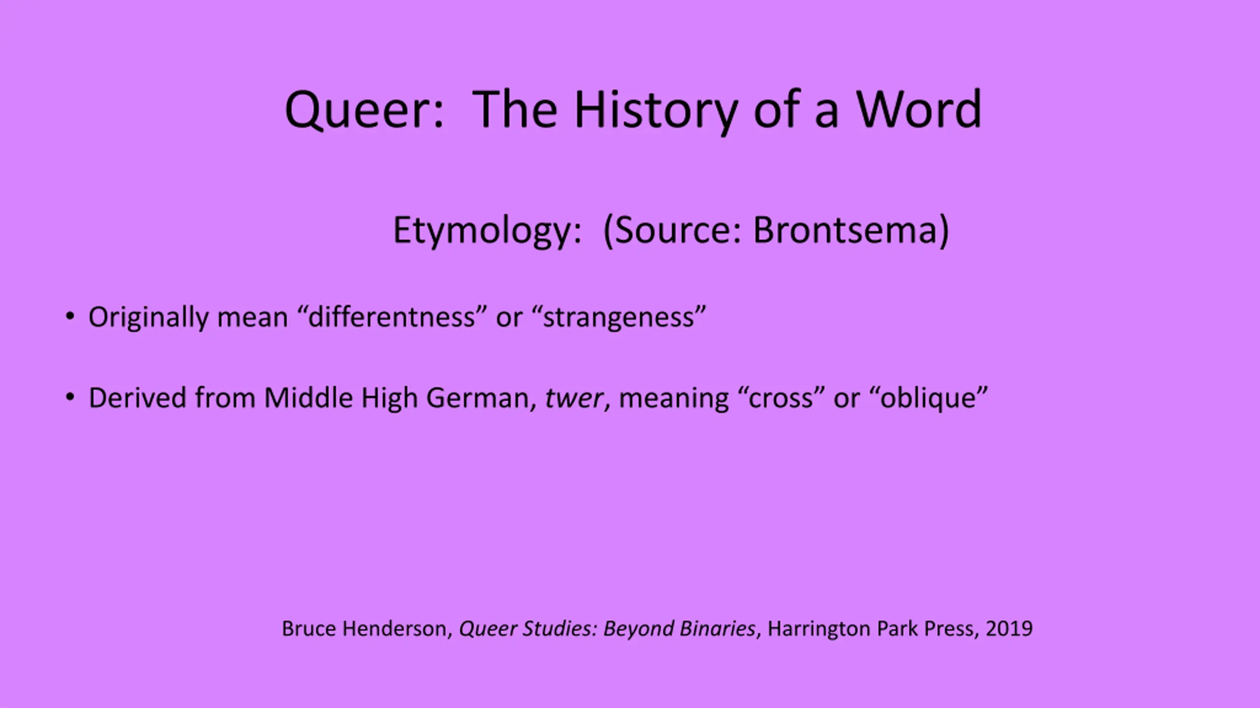 Queer: The History of a Word Etymology: (Source: Brontsema) Originally mean differentness or strangeness Derived from Middle High German, twer, meaning cross or oblique Bruce Henderson, Queer Studies: Beyond Binaries, Harrington Park Press, 2019
