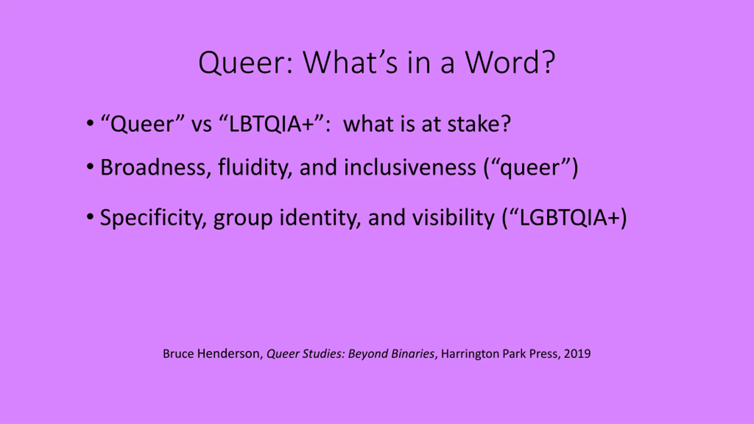 Queer: Whats in a Word? Queer vs LBTQIA+ : what is at stake? Broadness, fluidity, and inclusiveness ( queer ) Specificity, group identity, and visibility ( LGBTQIA+) Bruce Henderson, Queer Studies: Beyond Binaries, Harrington Park Press, 2019