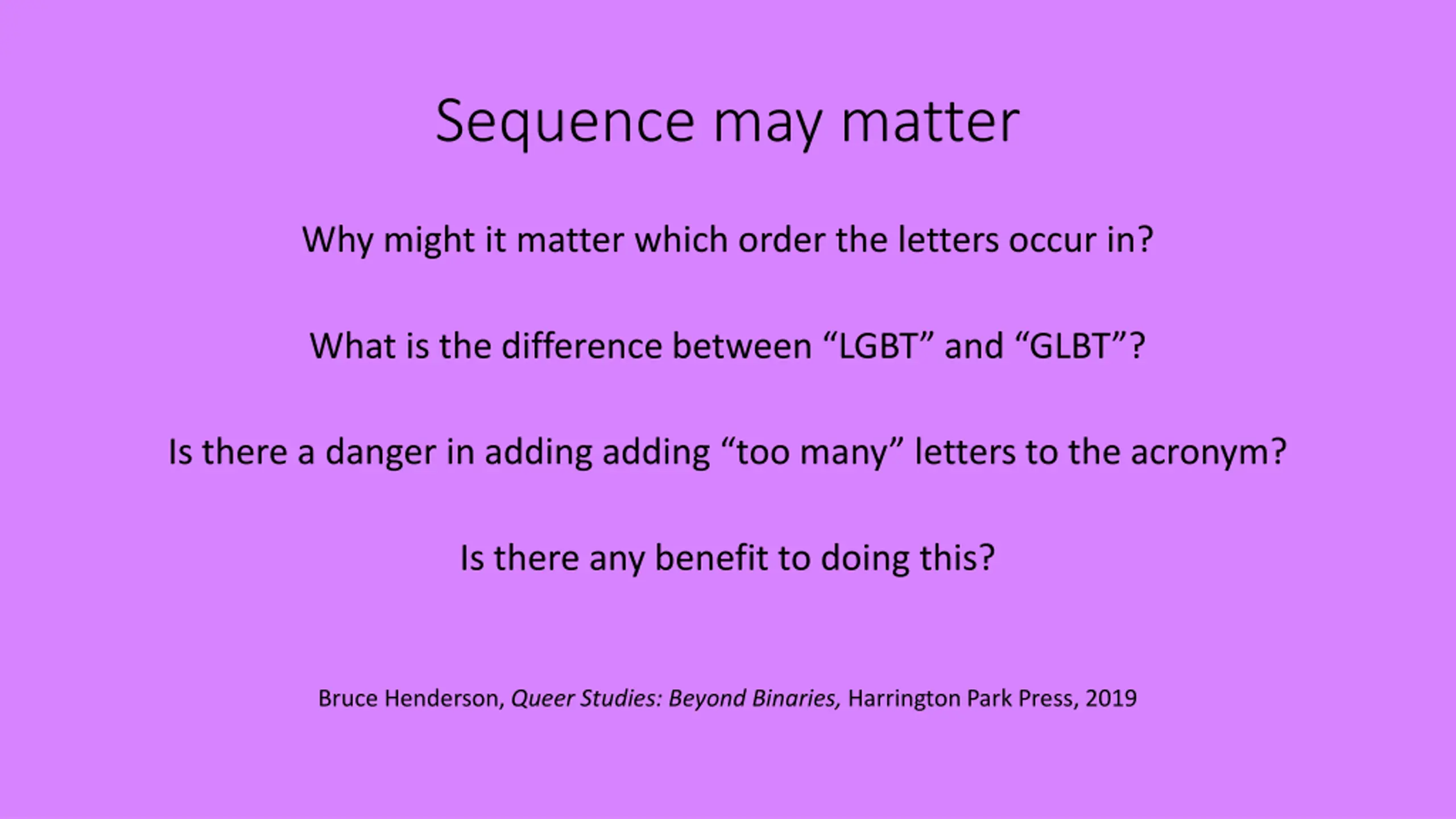 Sequence may matter Why might it matter which order the letters occur in? What is the difference between LGBT and GLBT ? Is there a danger in adding adding too many letters to the acronym? Is there any benefit to doing this? Bruce Henderson, Queer Studies: Beyond Binaries, Harrington Park Press, 2019