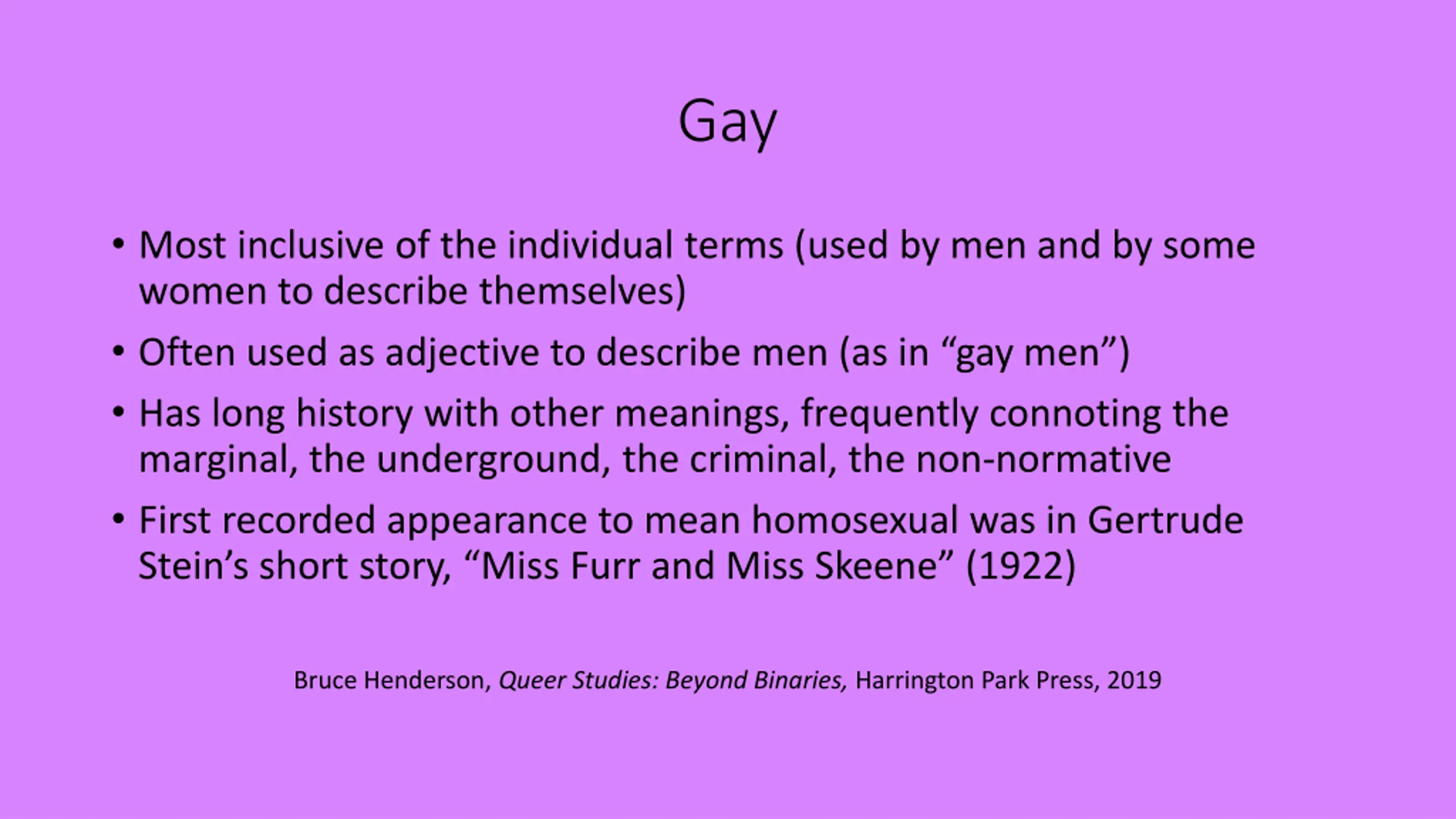 Gay Most inclusive of the individual terms (used by men and by some women to describe themselves) Often used as adjective to describe men (as in gay men ) Has long history with other meanings, frequently connoting the marginal, the underground, the criminal, the non-normative First recorded appearance to mean homosexual was in Gertrude Stein s short story, Miss Furr and Miss Skeene (1922) Bruce Henderson, Queer Studies: Beyond Binaries, Harrington Park Press, 2019