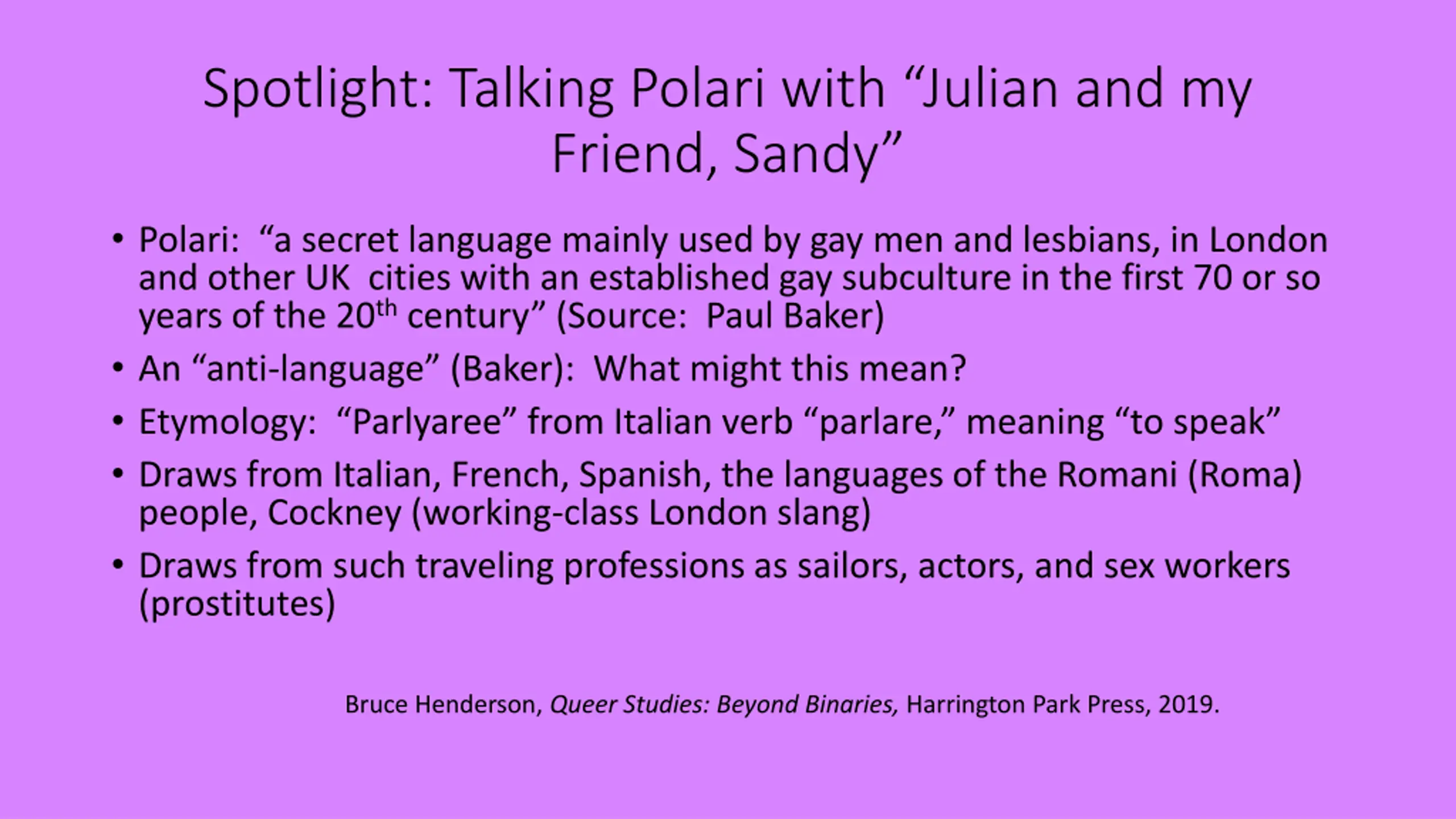 Spotlight: Talking Polari with Julian and my Friend, Sandy Polari: a secret language mainly used by gay men and lesbians, in London and other UK cities with an established gay subculture in the first 70 or so years of the 20thcentury (Source: Paul Baker) An anti-language (Baker): What might this mean? Etymology: Parlyaree from Italian verb parlare, meaning to speak Draws from Italian, French, Spanish, the languages of the Romani (Roma) people, Cockney (working-class London slang) Draws from such traveling professions as sailors, actors, and sex workers (prostitutes) Bruce Henderson, Queer Studies: Beyond Binaries, Harrington Park Press, 2019.